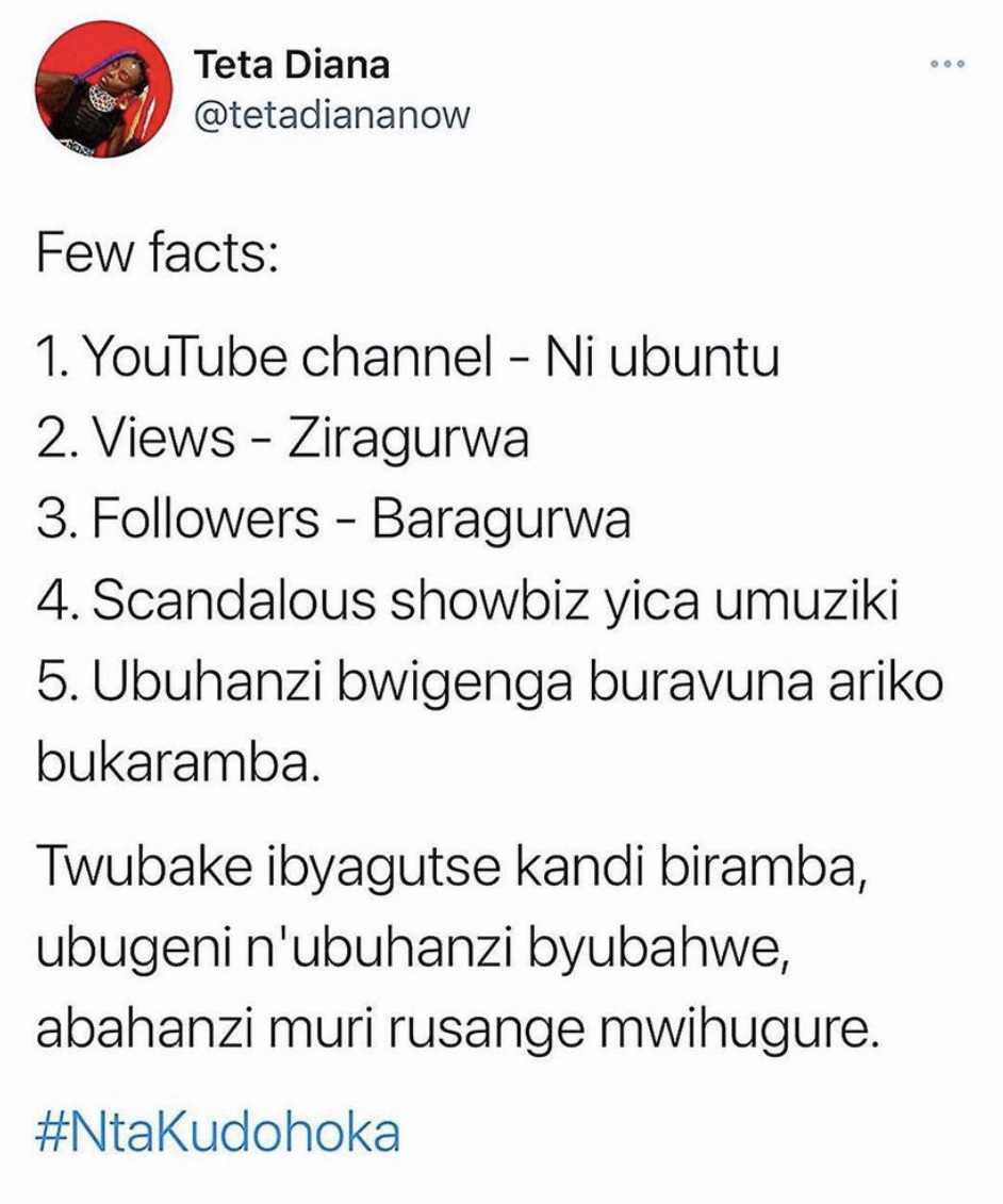 Si The Cat gusa ukubitiwe mu gafuka kuko na Teta Diana nawe yaraye akubiswe n’itagira amazi nyuma yo gushaka kwerekana ko hari abahanzi bagura views abisanisha nuko indirimbo My Vow ya Meddy yaciye agahigo ko kugira views nyinshi mu gihe gito. Nyuma yo kotswaho igitutu n’abakoresha Twitter, Teta Diana yahise agira konti ye ya Twitter private kugirango agabanye igitutu yashyirwagwaho gusa ab’inkwakuzi bari bamaze kubika amagambo Teta yavuze.