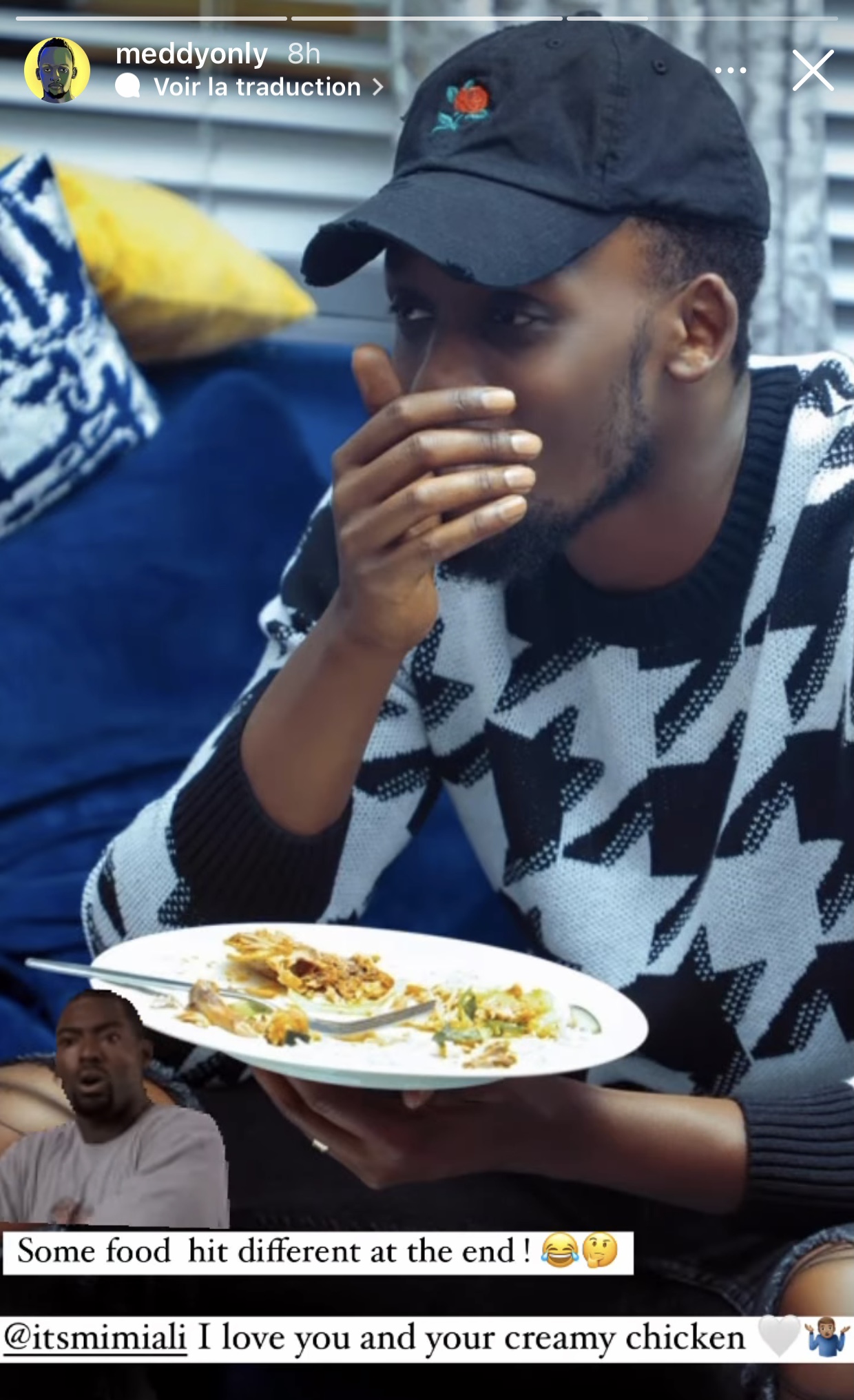 Nyuma yuko Meddy ashyize hanze aya mafoto yahise anayasangiza abafana be kuri story ya instagram ye maze ayaherekesha amagambo agira ati « Some food hit different at the end!😂🤔 @itsmimiali I love you and your creamy chicken 🤍🤷🏻‍♂️».