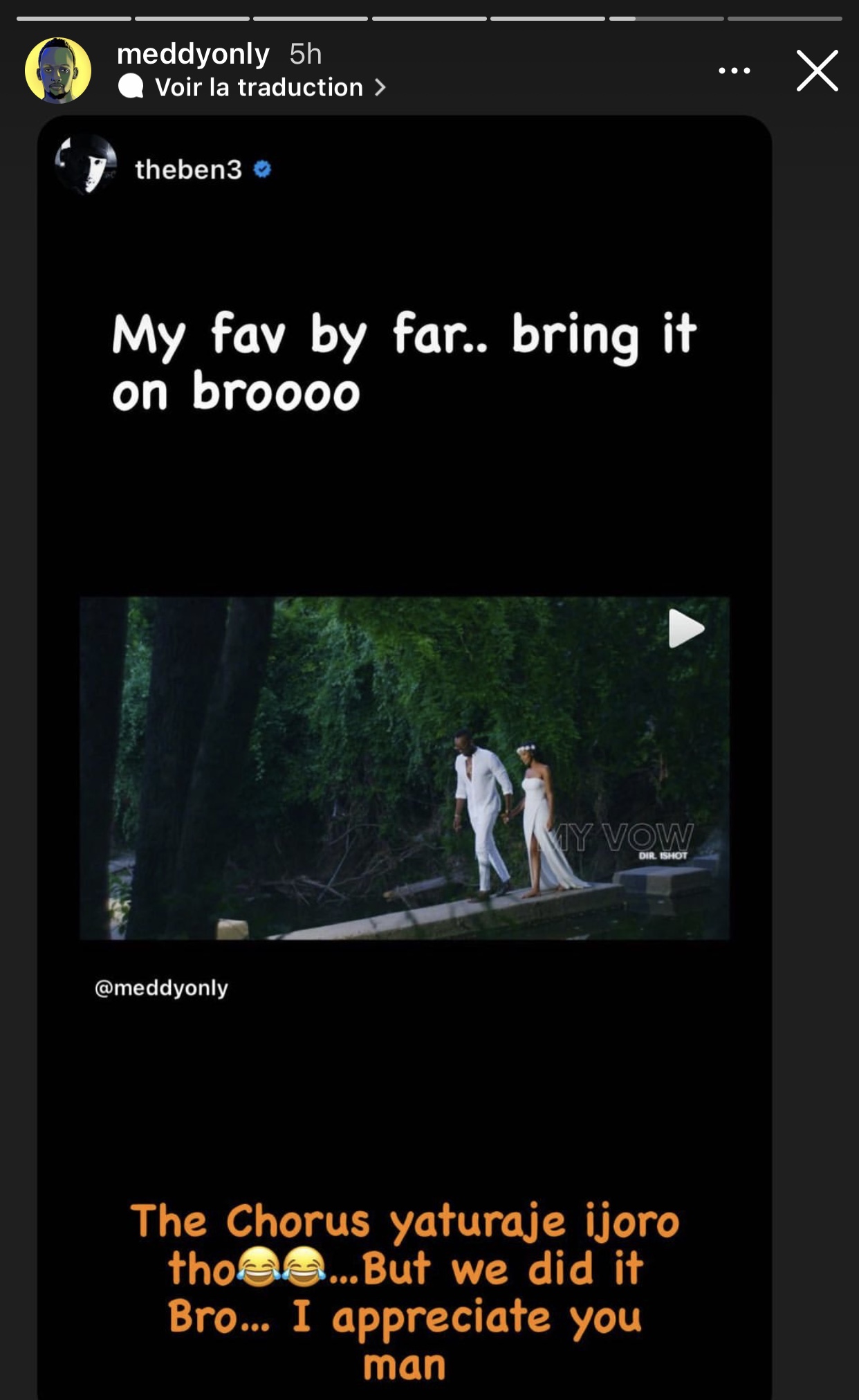Meddy abinyujije kuri story ya instagram ye yatangaje amagambo agira ati « The chorus yaturaje ijoro tho😂😂… But we did it  Bro… I appreciate you man ». Ni nyuma yuko The Ben yari amaze kuvuga ko indirimbo Vow ari indirimbo yakunze cyane mu magambo agira ati « My fav by far.. bring it on broooo ».