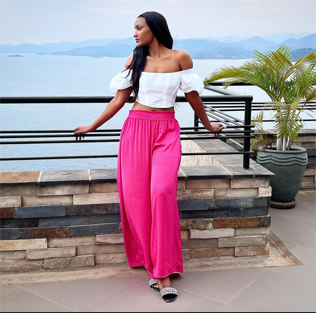Abinyujije kurukuta rwe rwa Instagram yashyizeho amafoto yambaye imyambaro myiza harimo ipanaro itukura ndetse n’agapira ku mweru kagaragaraza mu gatuza he ndetse arenzaho ijambo avuga ko weekend utangiye.