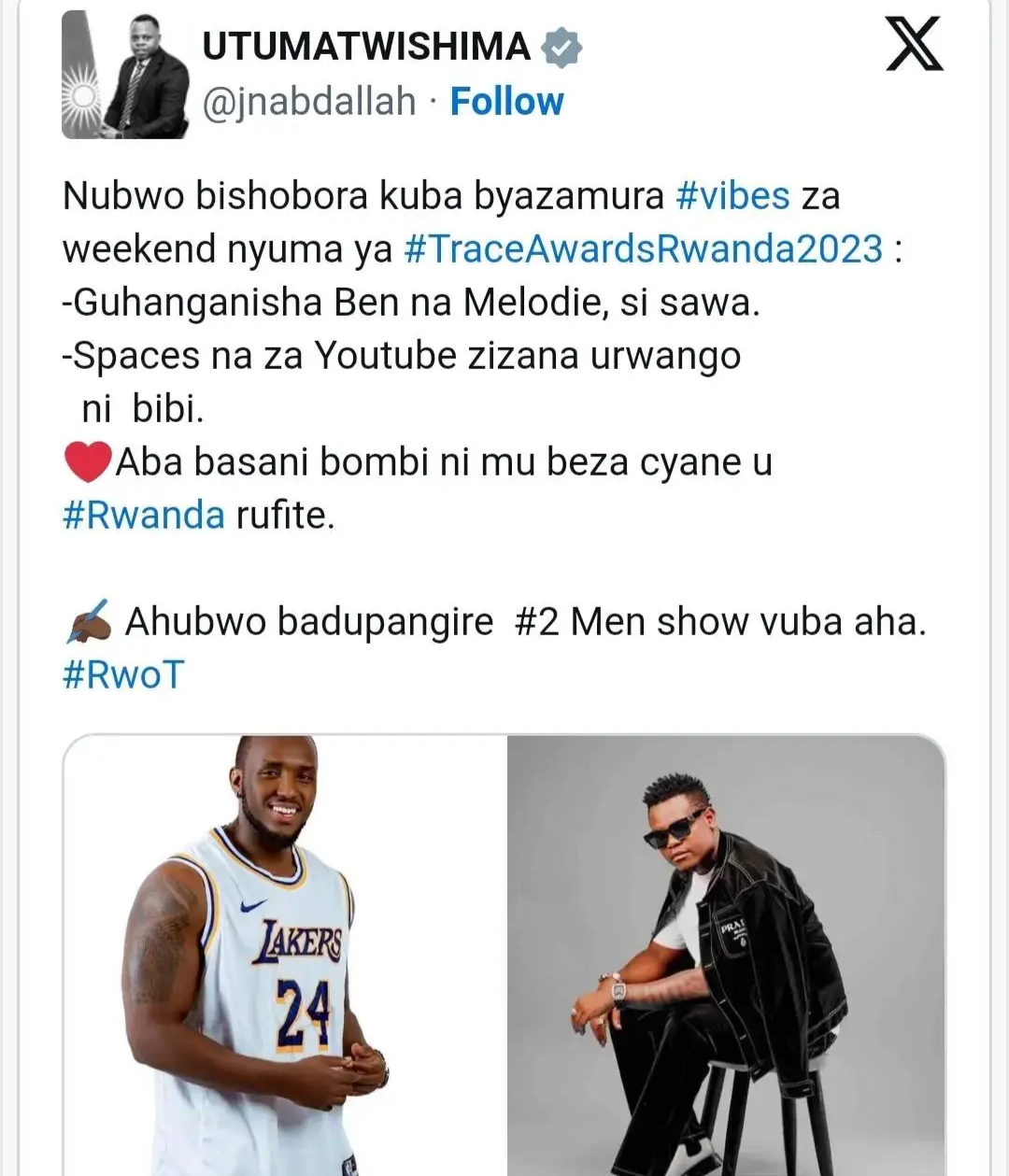 Ni ubutumwa yajyujije ku rukuta rwe rwa X nyuma y’itangwa ry’ibihembo bya Trace Awards, avuga ko rwose abantu bahanganisha The Ben na Bruce Melodie atari byiza.