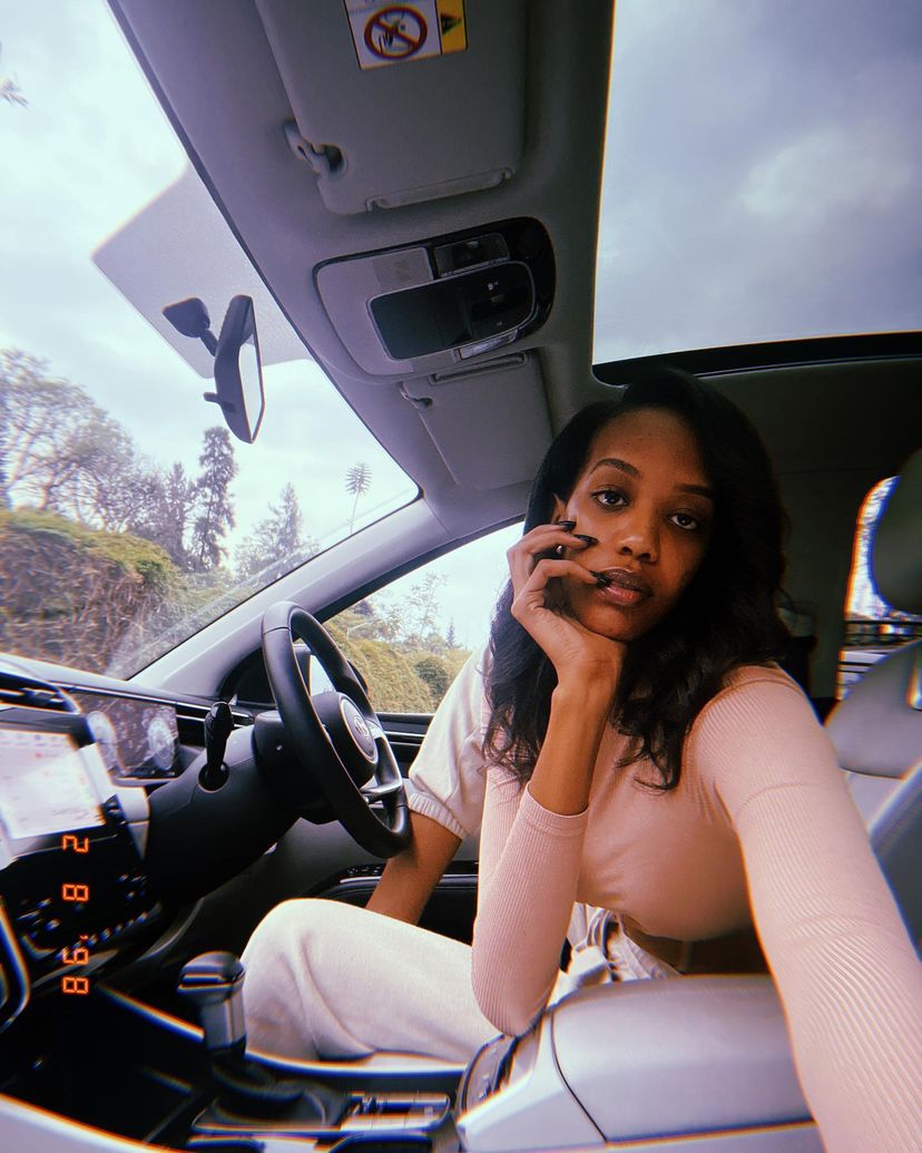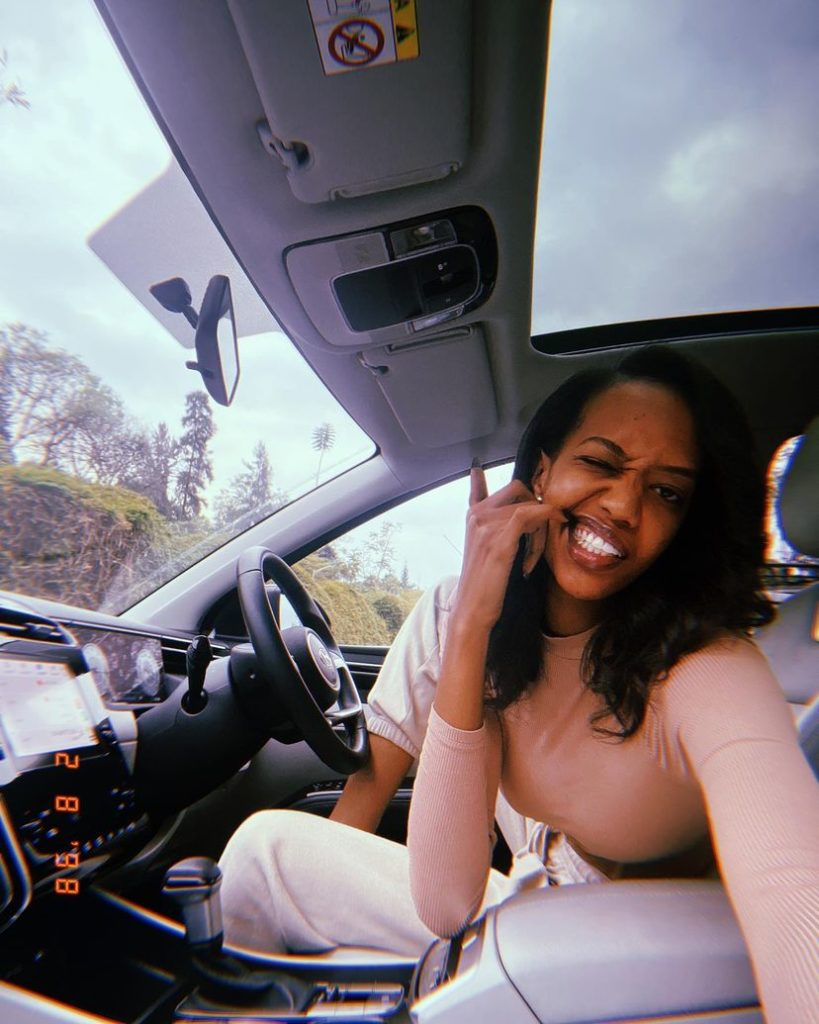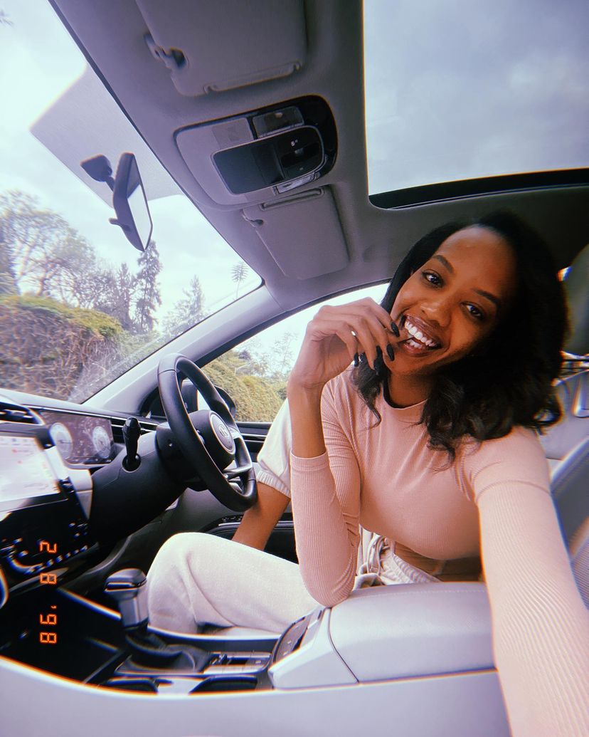 Miss Iradukunda Elsa wegukanye ikamba rya Miss Rwanda mu mwaka wa 2017 yagaragaye afite akanyamuneza kenshi ari mu modoka ye.