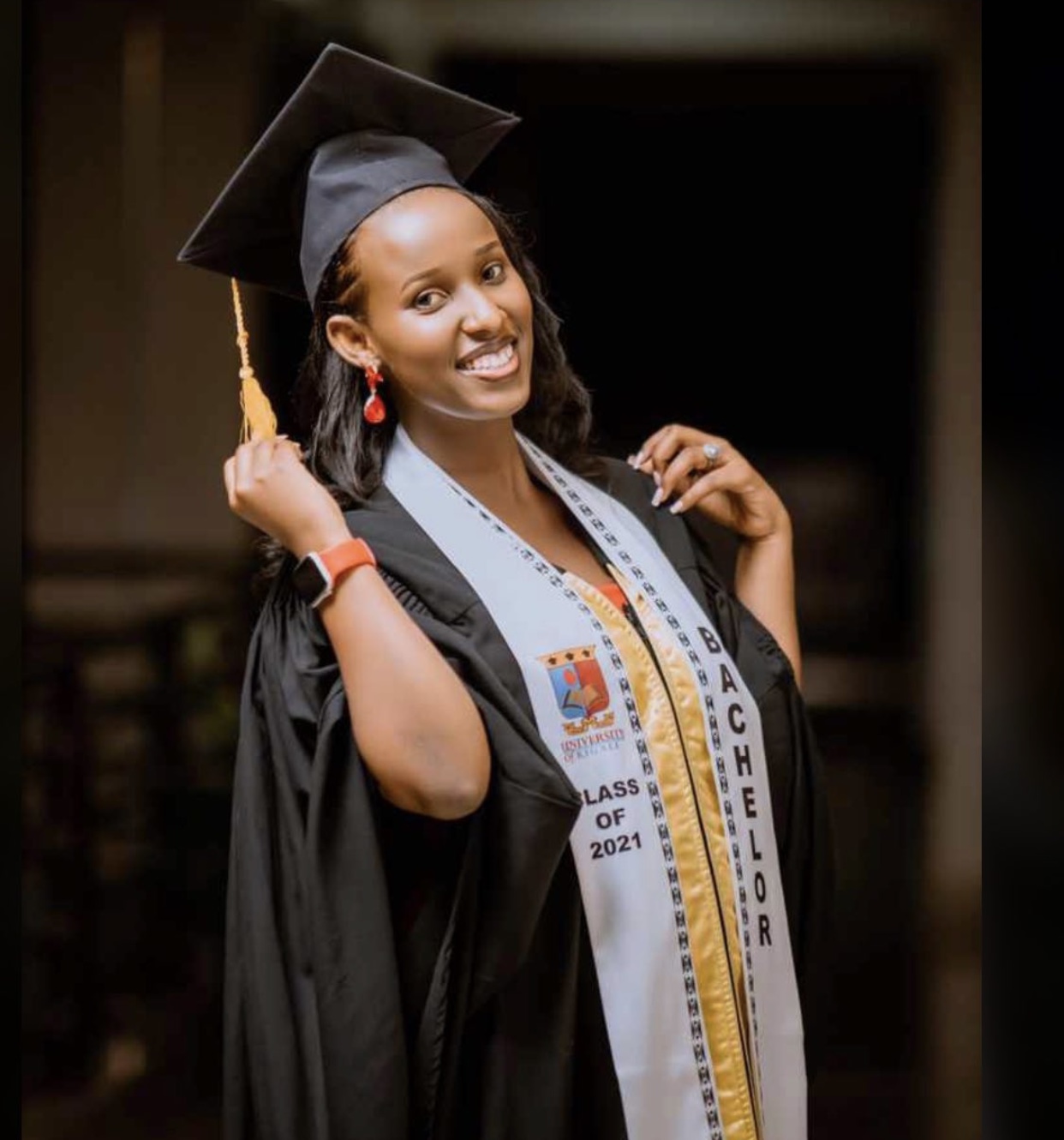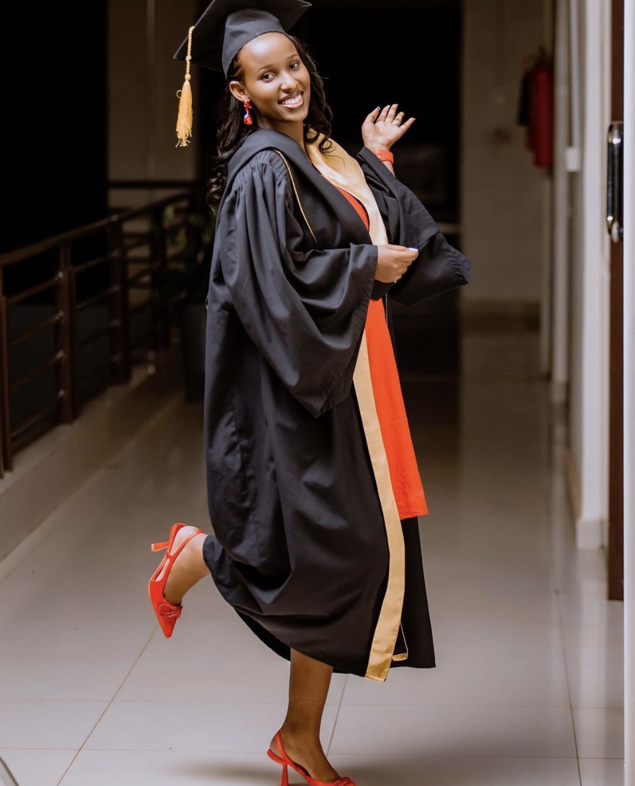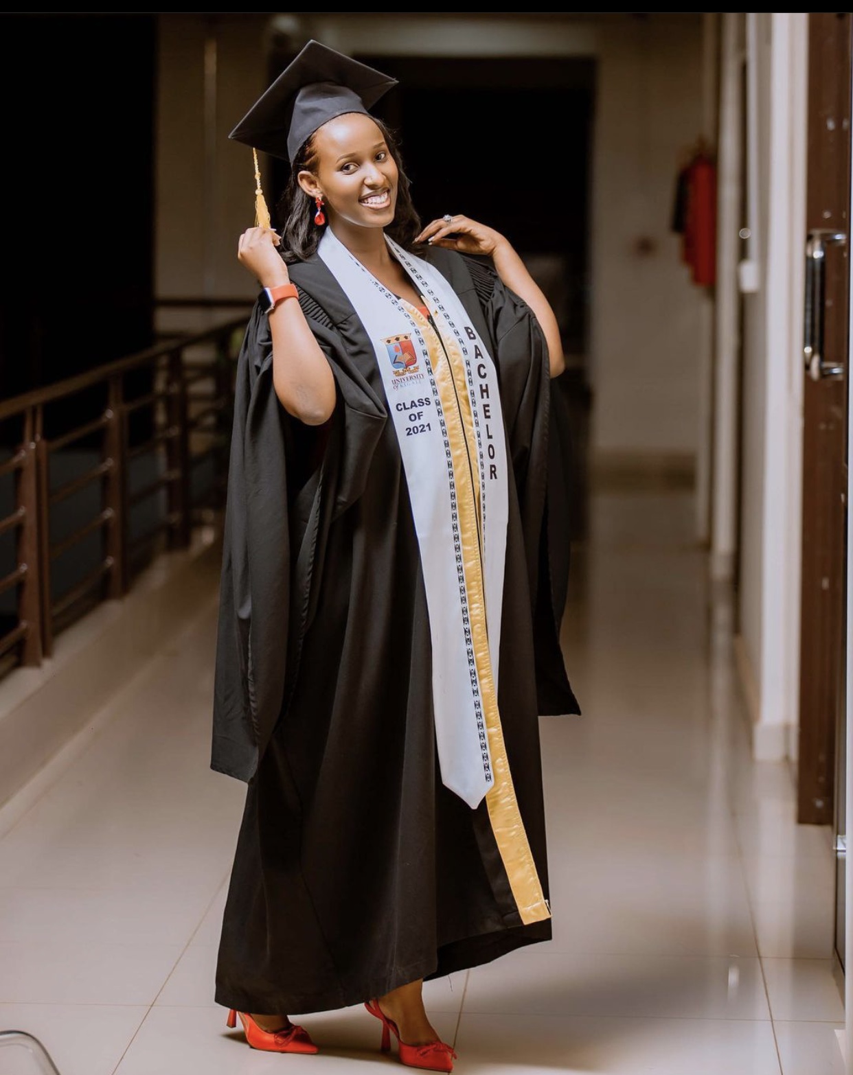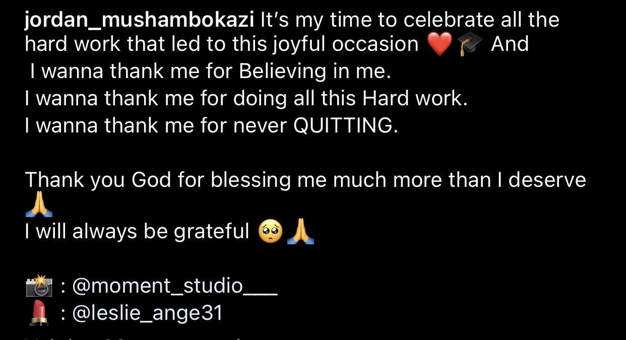 Abinyujije ku rukuta rwe rwa instagram, Miss Jordan Mushambokazi yashyize hanze amafoto ye yambaye ikanzu (graduation gown) maze ayaherekesha amagambo akurikira: