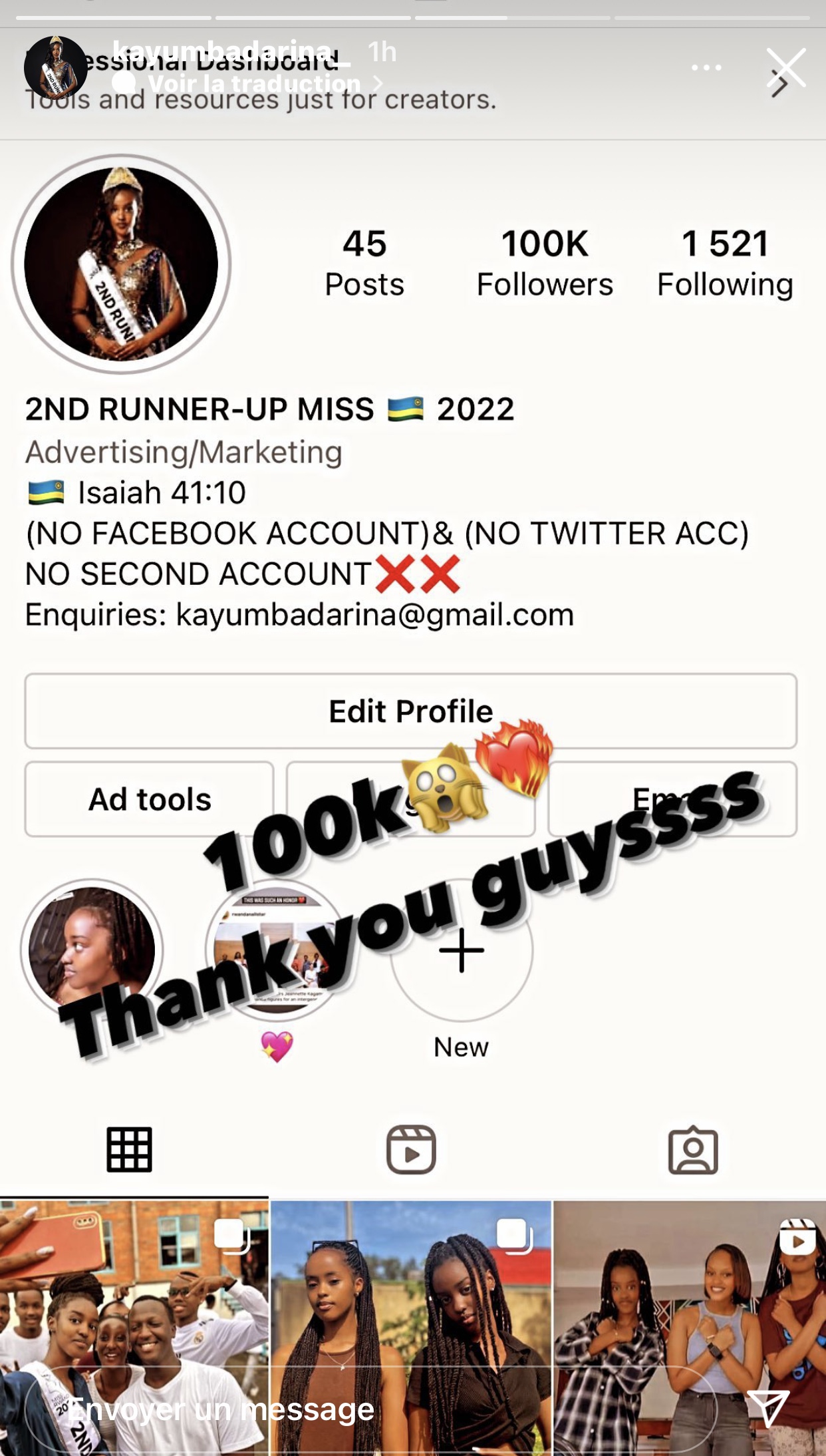 Kayumba Darina abinyujije kuri story ya instagram ye yashyizeho ifoto igaragaza umubare w’abantu basaga ibihumbi ijana bamukurikira kuri instagram maze ayiherekesha amagambo agira ati « 100k 🙀❤️‍🔥 Thank you guyssss ».