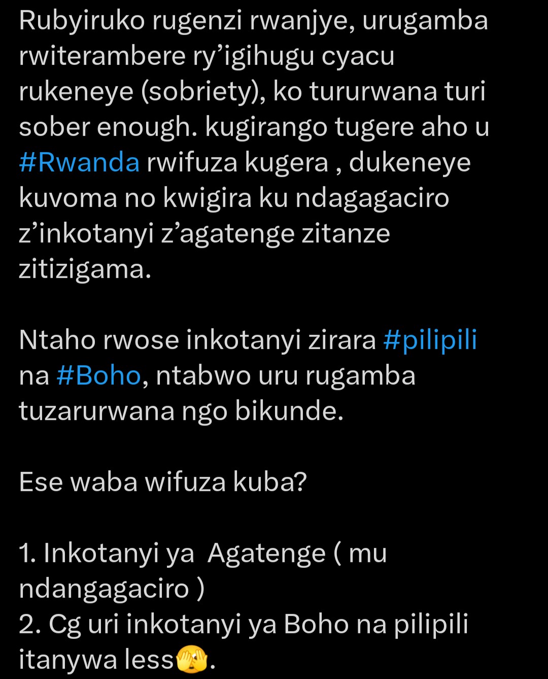 ” Cg uri inkotanyi ya Boho na pilipili itanywa less.”