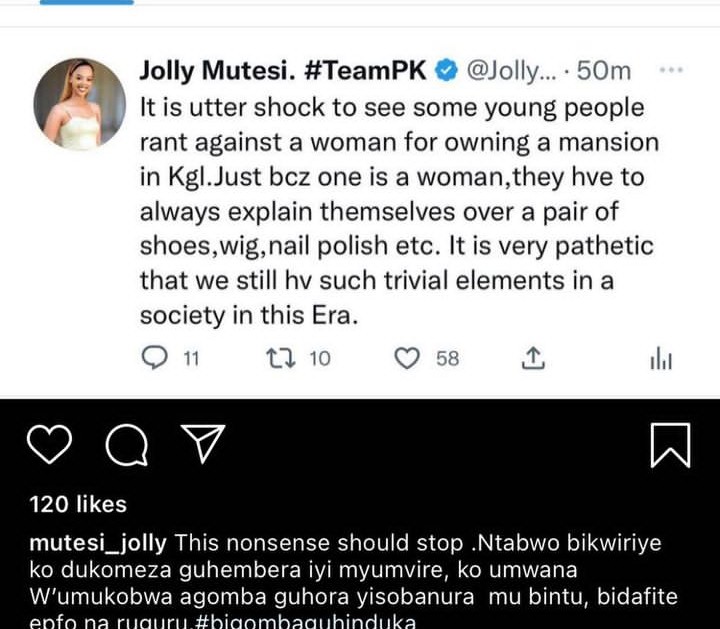 Ni mu butumwa Miss Mutesi Jolly yatambukije kuri Twitter atangaza ko bibabaje binateye agahinda kuba umukobwa cyangwa umugore ugize icyo ageraho abazwa aho yabikuye.