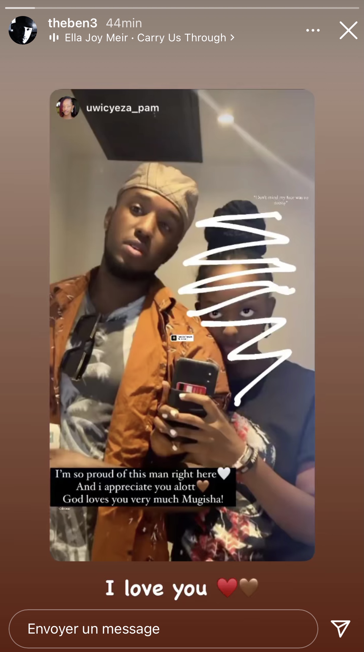 Nkuko byagaragaye kuri story ya instagram ya Miss Pamella Uwicyeza, uyu mukobwa yashyize hanze ifoto ye ari kumwe na The Ben maze ayiherekesha amagambo agira ati « I’m so proud of this man right here 🤍 And I appreciate you alott🤎 God loves you very much Mugisha! ». The Ben nawe ntiyaripfanye yahise asubiza umwari wamunyuze umutima mu magambo agira ati « I love you❤️🤎 ».
