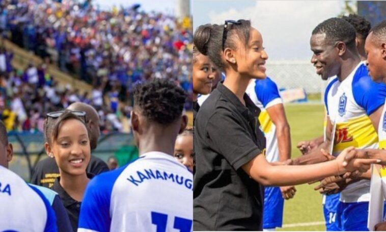 Miss Muheto Divine yari afite akanyamuneza ubwo yasuzaga abakinnyi b’ikipe yihebeye
