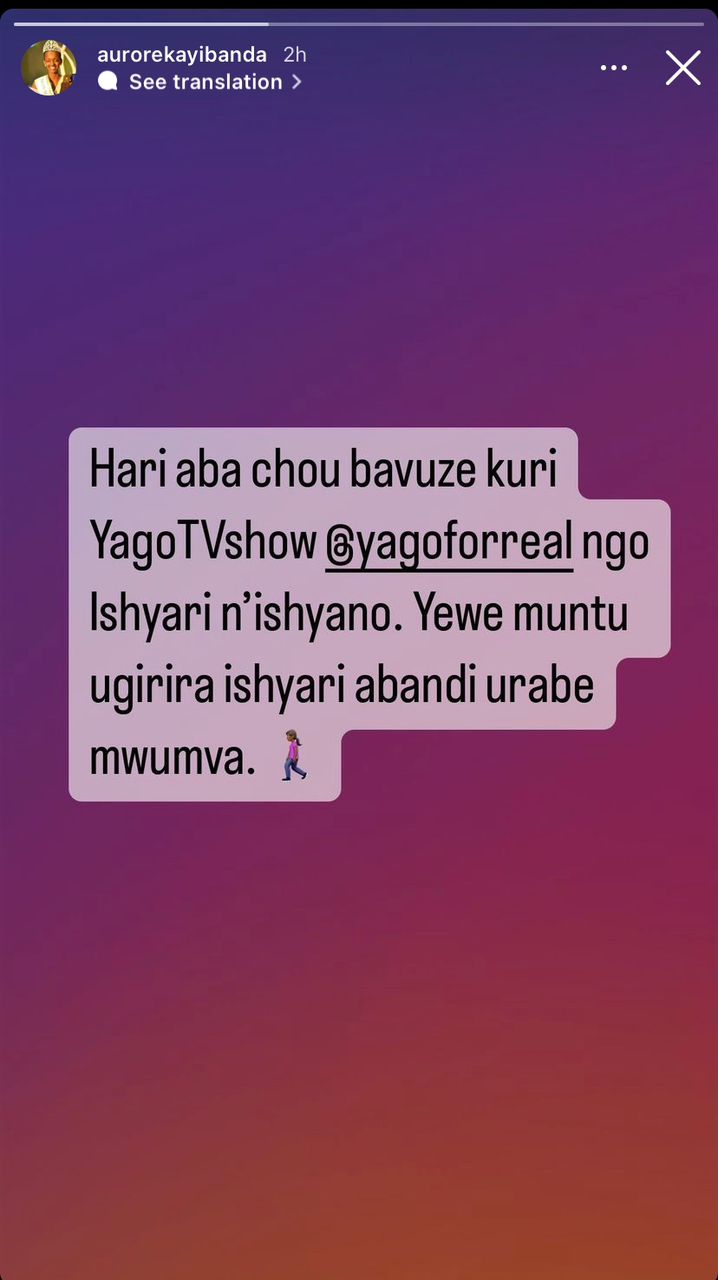 Aurore Kayibanda yifashishije ikiganiro atasobanuye neza cyaciye  ku muyoboro wa youtube wa  Yago Tv Show , yagize ati:” Hari abachou  bavuze kuri yago tv show ngo ishyari n’ishyano , yewe muntu ugirira ishyari abandi urabe wumva”