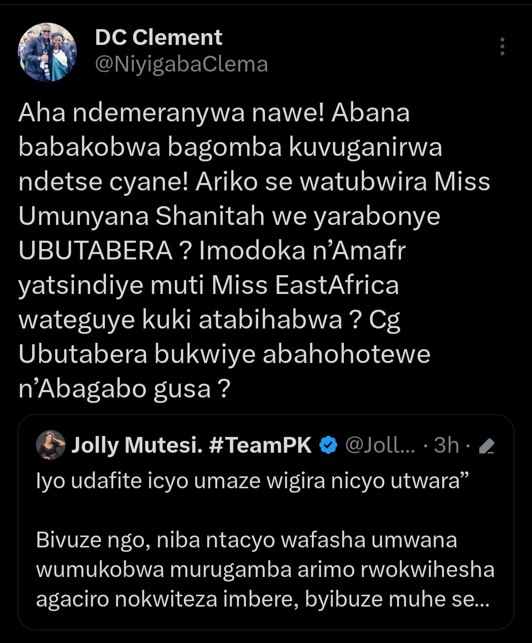 DC Clement yagize ati: “Aha ndemeranywa nawe! Abana babakobwa bagomba kuvuganirwa ndetse cyane! Ariko se watubwira Miss Umunyana Shanitah we yarabonye UBUTABERA? Imodoka n’Amafr yatsindiye muti Miss EastAfrica wateguye kuki atabihabwa? Cg Ubutabera bukwiye abahohotewe n’Abagabo gusa?”