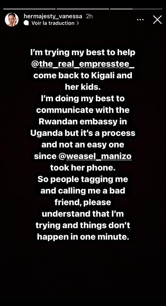 Ugenekereje mu Kinyarwanda ubutumwa Teta Sandra yanditse bushatse kuvuga ngo « ndikugerageza uko nshoboye ngo mfashe TETA SANDRA kugaruka i Kigali na abana be ndimo gukora uko nshoboye kugira ngo mvugane na ambasade y’u Rwanda muri Uganda ariko ni inzira ndende kandi ntabwo yoroshye kuva @weasel_manizo yafata terefone ye ntabwo mbasha kumuvugisha abantu rero bari kumbaza no kunyita inshuti mbi, nyamuneka mwumve ko ndimo ngerageza kandi ibintu ntibikora mu munota umwe ».