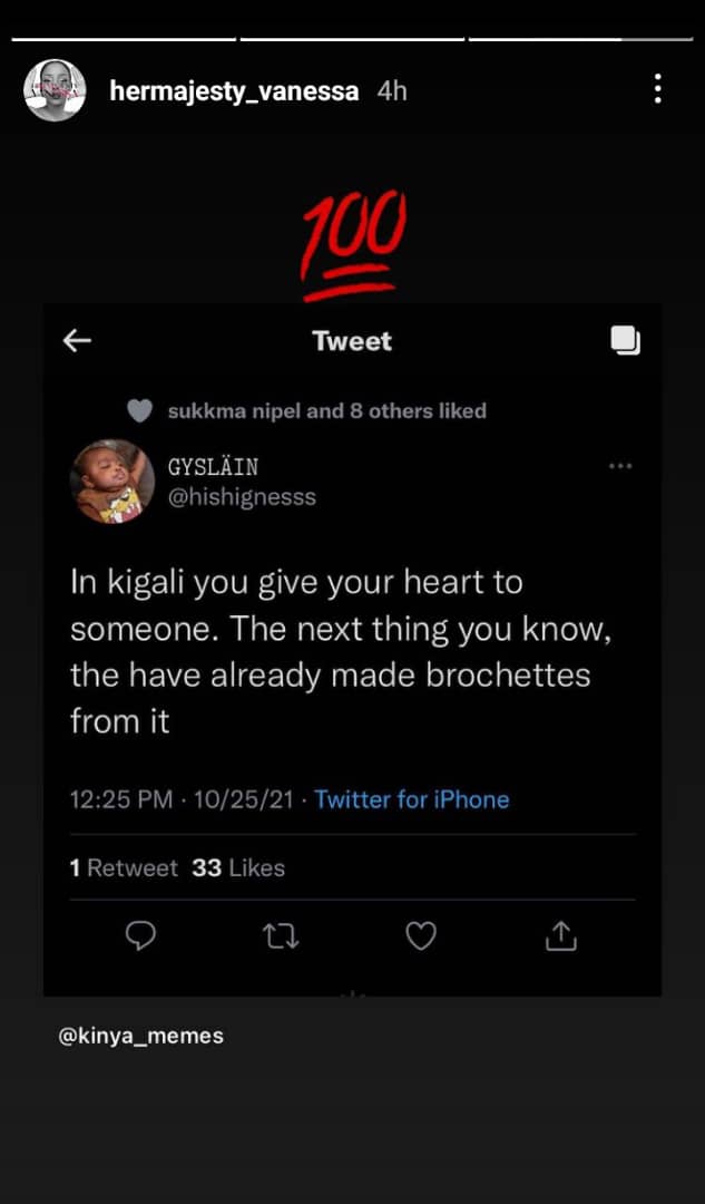 Amagambo Miss Vanessa yashyize hanze agira ati « In Kigali you give your heart to someone. The next thing you know, they have already made brochettes from it ».