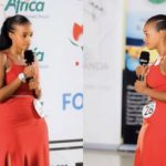Uyu mukobwa yaserutse imbere y’akanama nkemurampaka ari uwa makumyabiri n’umunani, yaserutse mu ikanzu nziza y’umutuku.