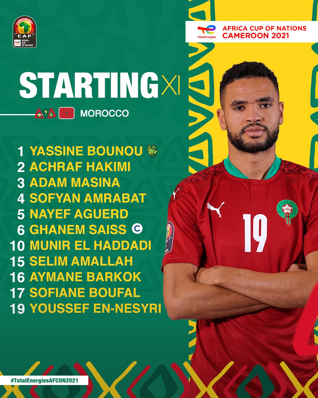 Ikipe y’igihugu ya Morocco yatangiranye penariti ku ikosa ryari rikozwe na Ayman Ashraf arikorera Achraf Hakimi. Penariti yaje guterwa neza na Sofian Buffalo ahita afungura amazamu.
