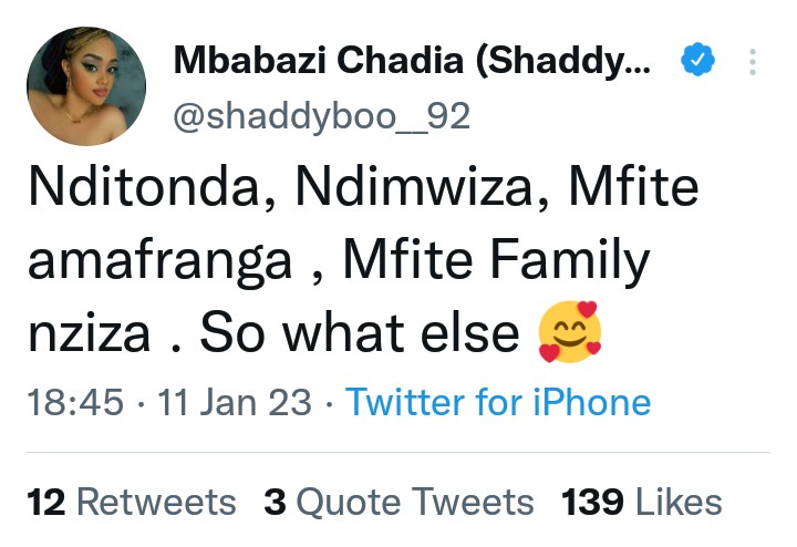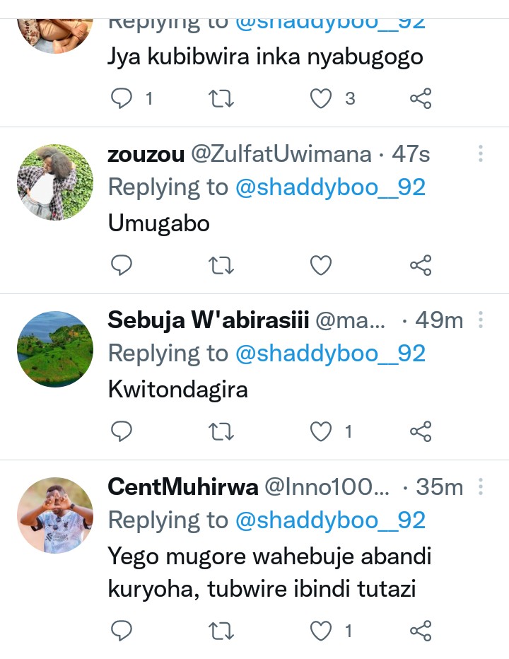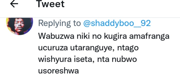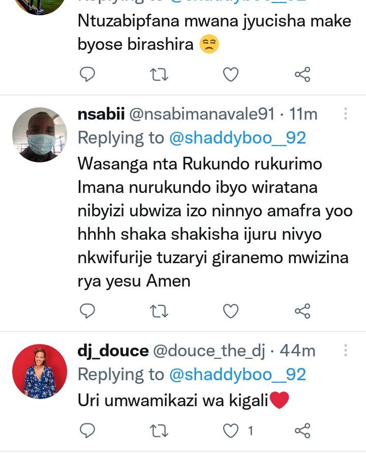 Mbabazi Shadia uzwi nka Shaddy Boo abinyujije kuri Twitter ye ikurikirwa n’abantu barenga ibihumbi 182 yanyujijeho ubutumwa bukubiyemo kwirata ubwo yahamyaga ko ibintu byose akeneye mu buzima bwe abifite.