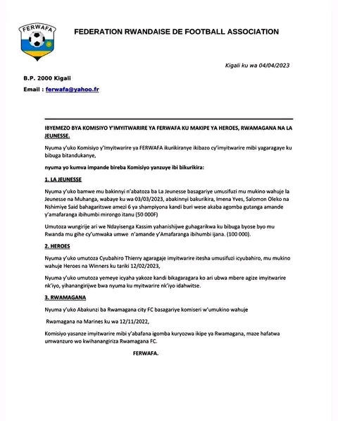 FERWAFA ibinyujije muri Komisiyo y’imyitwarire yafatiye ibyemezo La