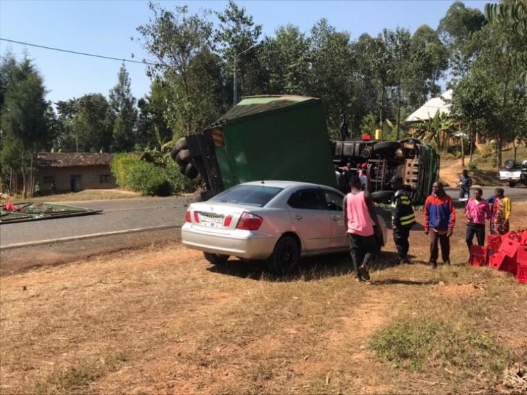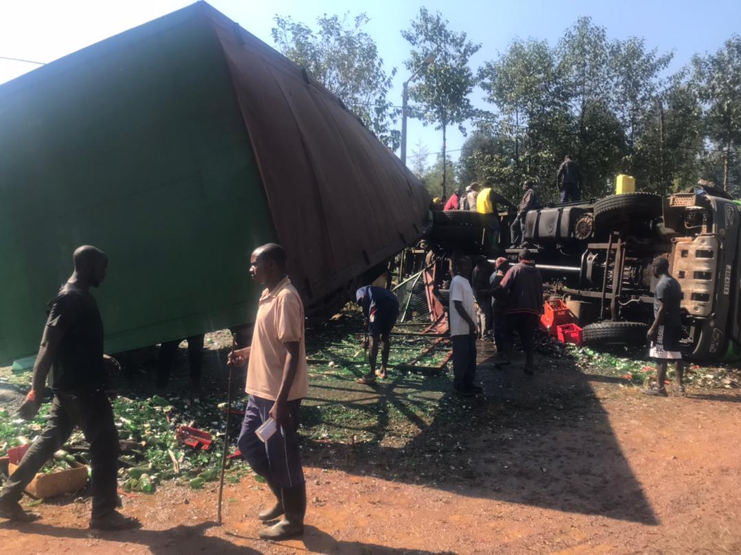 Ati “Ikamyo itwaye ibinyobwa bya Bralirwa yakoze impanuka, harakekwa ko yaba yabuze feri, gusa ntawayiburiyemo ubuzima.”