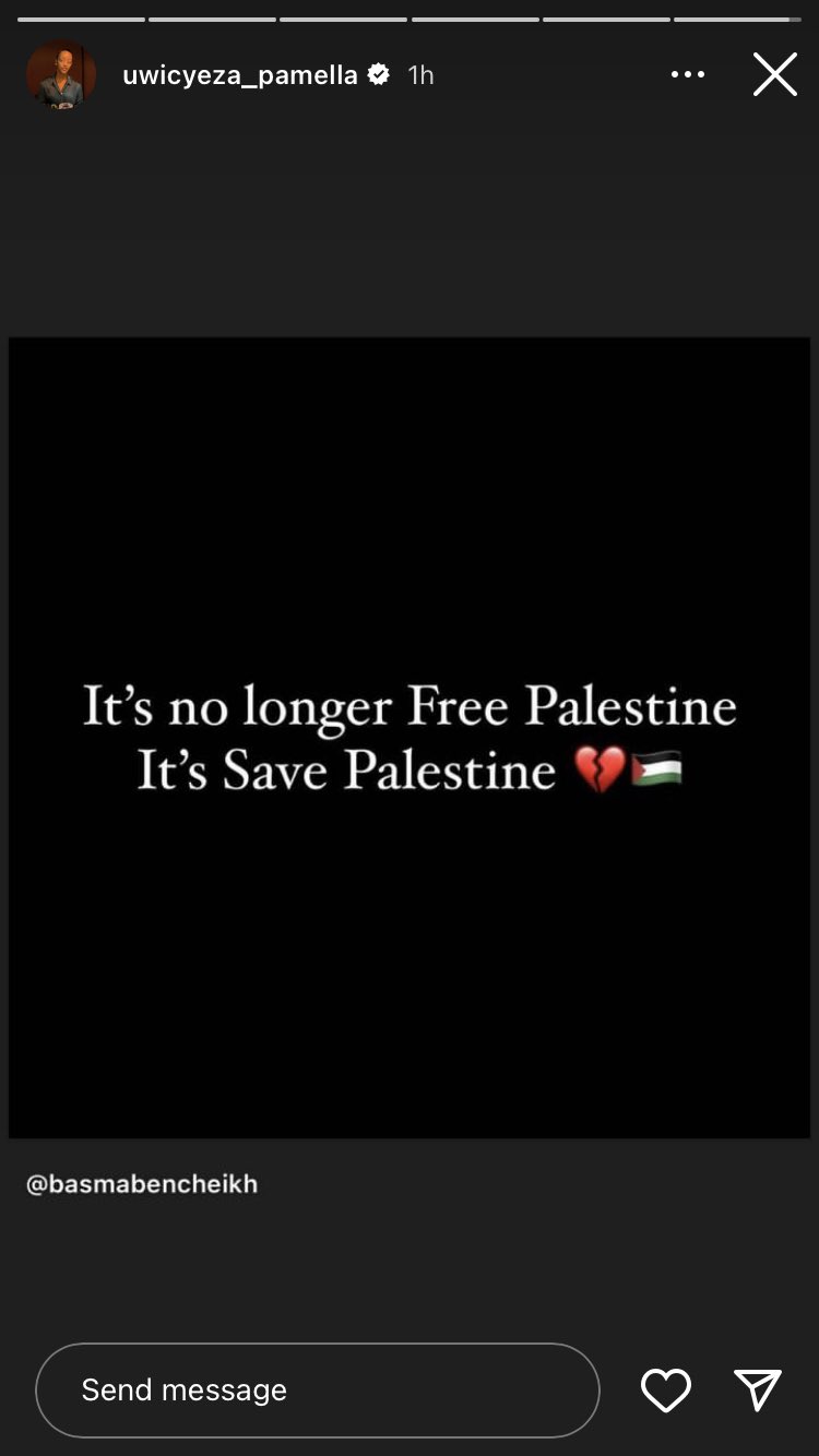 Abinyujije ku rukuta rwe rwa Instagram, Pamella Uwicyeza yagaragaje ko atewe agahinda n’ibyo intambara iri gukora muri Palestine, Pamella yavuze ko urwego bigezeho rutakiri urwo kuvuga gusa ngo Palestine bayireke, ahubwo ni urwo gutabara Palestine.
