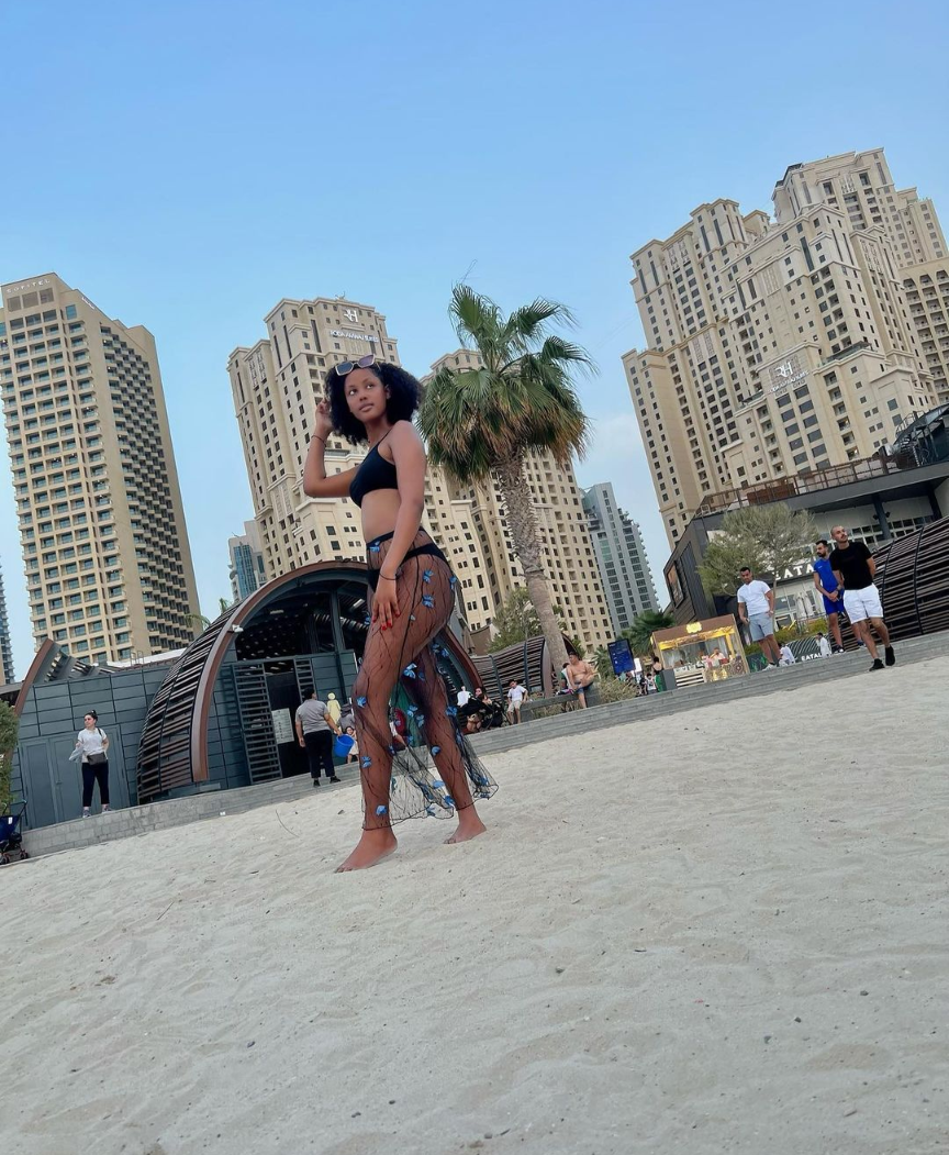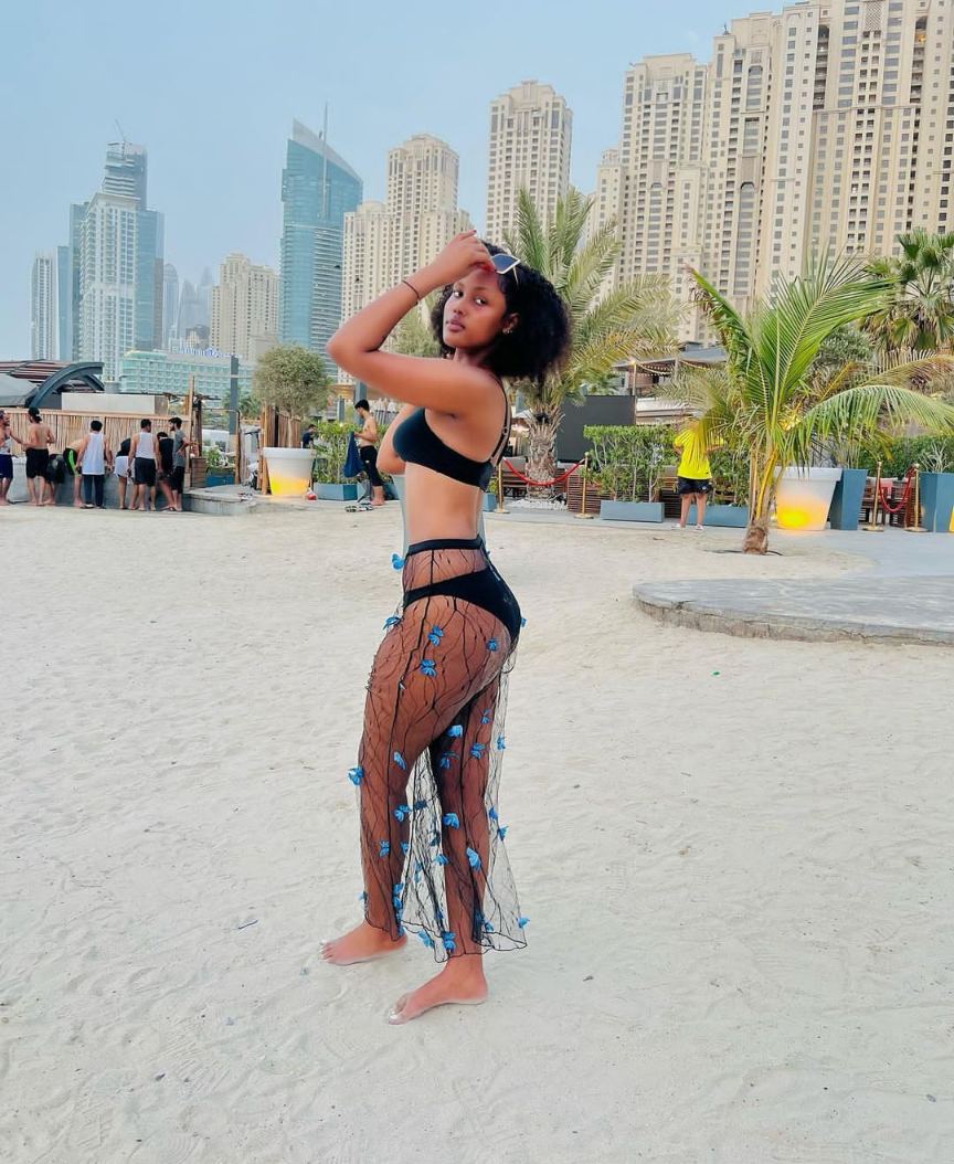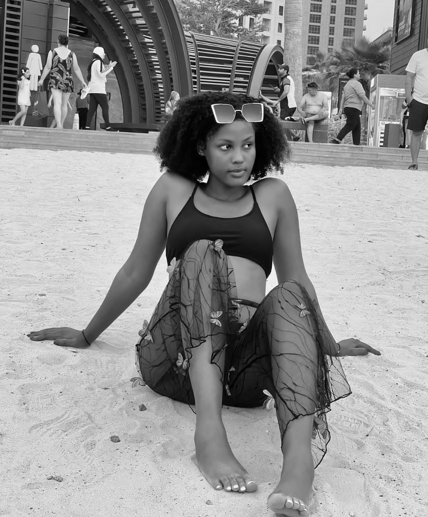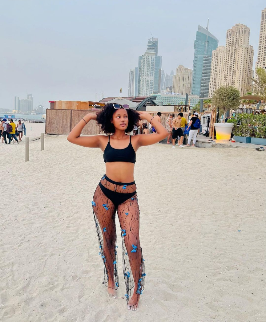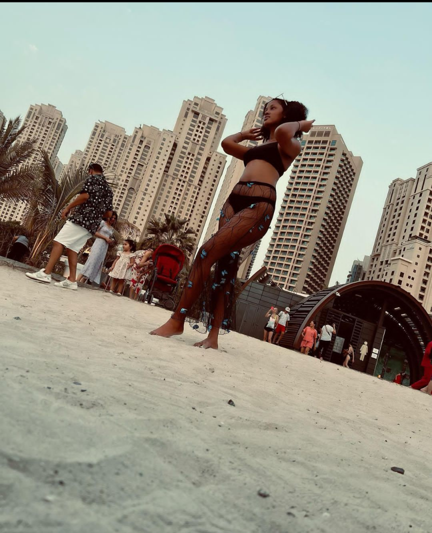 Mu mafoto yashyizwe ku mbuga nkoranyambaga z’uyu mukobwa w’umunyamideli ufite ubwiza n’imiterere birangaza benshi yamugaragaje ari ku mazi yahishe imyanya ye y’ibanga ibindi bice by’umubiri biri kukarubanda.
