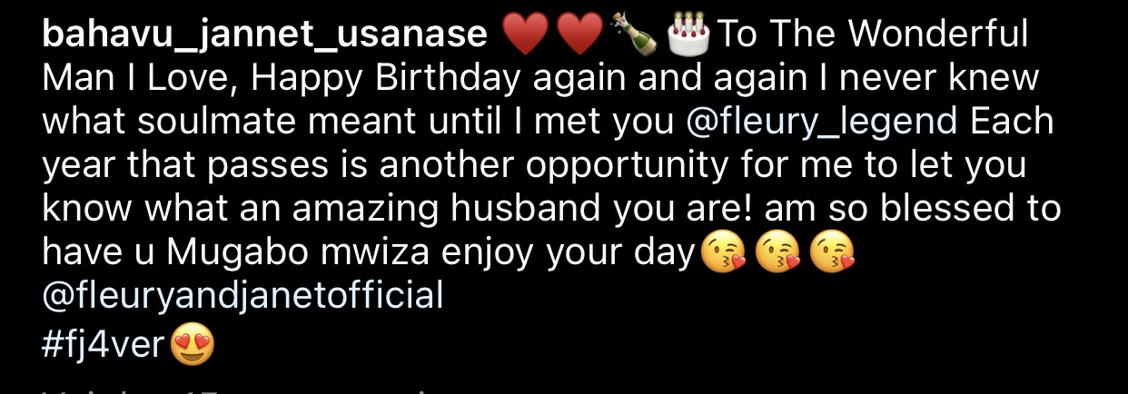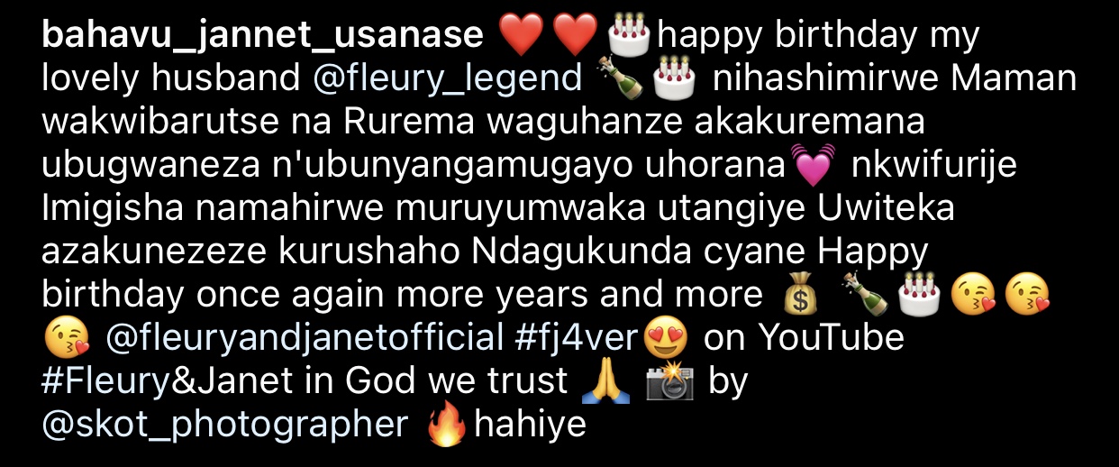 Kuri uyu wa 19 Ukwakira nibwo Fleury Ndayirukiye uzwi nka Fleury Legend akaba ari umugabo wa Bahavu Usanase Jannet, yizihiza isabukuru ye y’amavuko. Bahavu Jannet abinyujije ku rukuta rwe rwa instagram yifurije umugabo we isabukuru nziza amwibutsa agaciro afite mu buzima bwe.