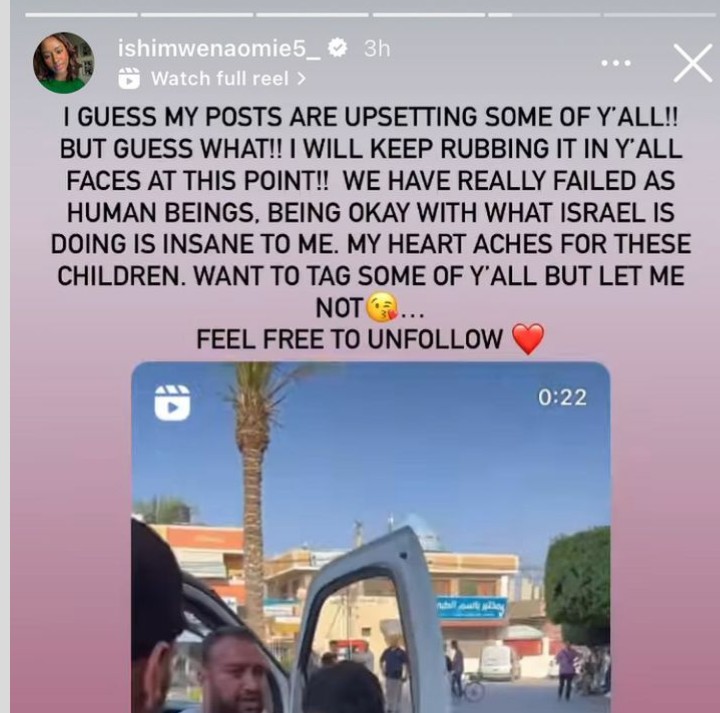 Nyampinga w’u Rwanda 2020 Ishimwe Naomi yashenguwe bikomeye n’urupfu rw’abasivile barimo abana bari kwica na Leta ya Israel mu gace ka Gaza.