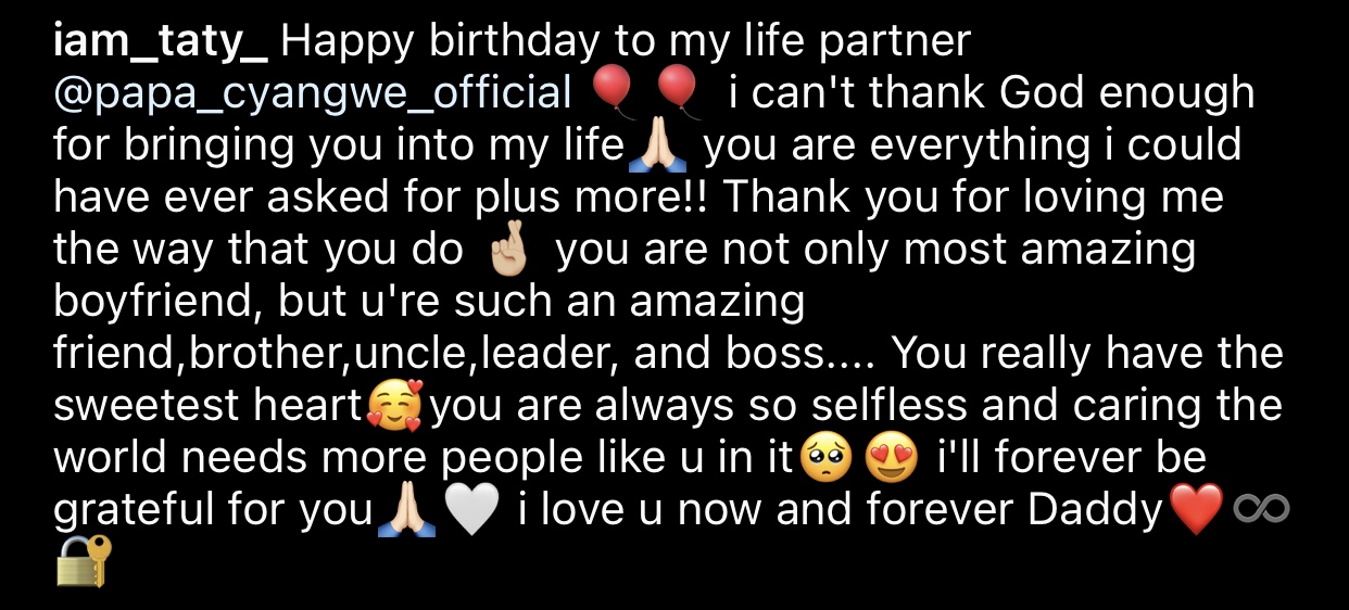 Kuri uyu wa 20 Mata nibwo Abijuru King Lewis wamamaye ku izina rya Papa Cyangwe yizihije isabukuru ye y’amavuko. Uwase Angel, umukunzi we, uzwi cyane ku izina rya Mama Cyangwe, abinyujije ku rukuta rwe rwa instagram yashyize hanze ifoto ye ari kumwe na Papa Cyangwe maze ayiherekesha amagambo ashimangira urukundo rwinshi amukunda ndetse anamwifuriza isabukuru nziza y’amavuko.