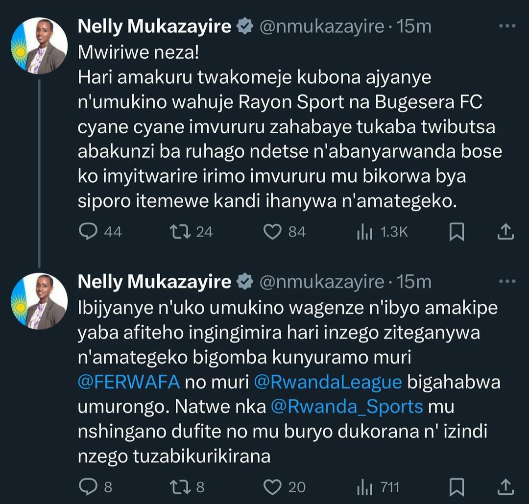 Minisitiri wa Siporo, Nelly Mukazayire, yatangaje ko uru rwego rwiteguye gukurikirana no gukemura ikibazo cy’imvururu zagaragaye ku mukino wahuje Bugesera FC na Rayon Sports wabaye ku wa Gatandatu. Abinyujije kuri konti ye ya X (Twitter), Minisitiri Mukazayire yavuze ko bababajwe n’aya makuru y’imyitwarire itari myiza yagaragaye muri uyu mukino, cyane cyane ko harimo imvururu zahungabanyije abakunzi ba ruhago n’abandi barebye umukino.
