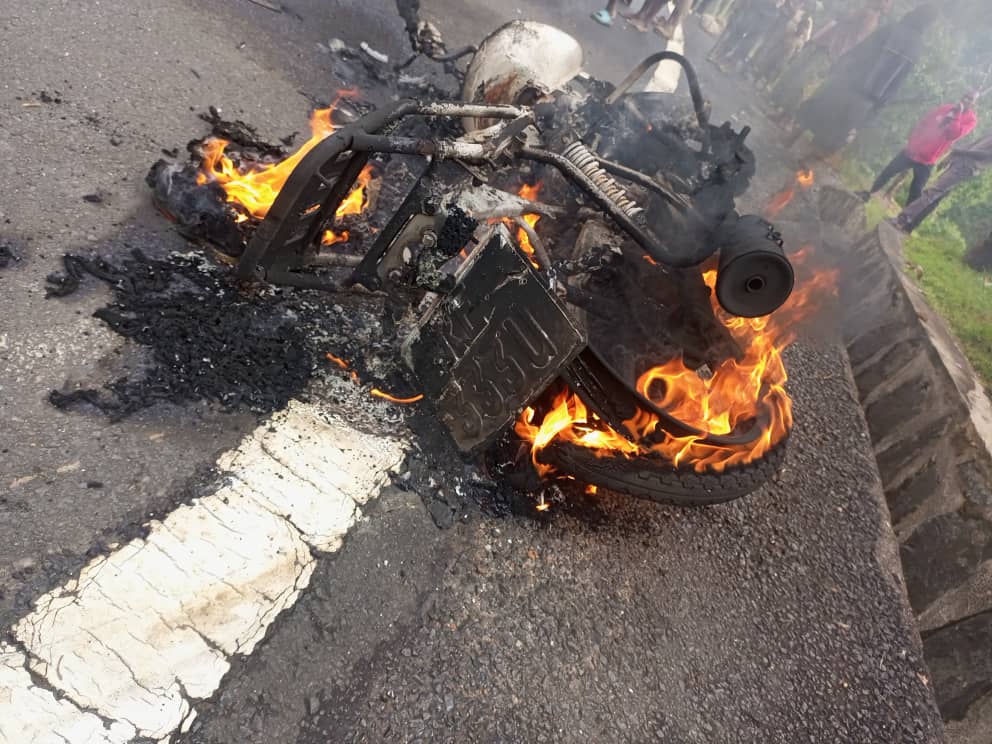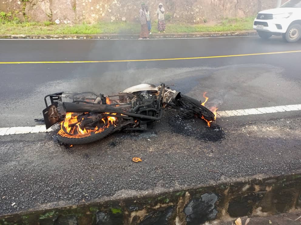 Moto yo mu bwoko bwa Boxer Boxer 150 ifite Pulake RE 333U yahiye irakongoka ariko mu by’amahirwe abo yari itwaye barusimbutse bakomeretse byoroheje, ndetse yabahiriye mu maso bayireba badashobora kugira icyo bakora ku manywa izuba riva.
