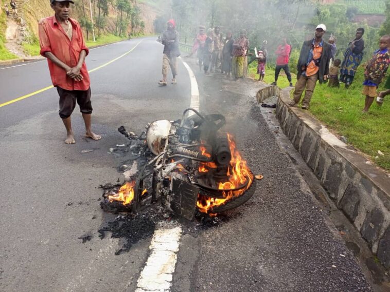 Mu muhanda ku manywa izuba riva! Moto yo mubwoko bwa Boxer yari igeze mu ikorosi ryo muri Ryodomori yerekeza Nyamasheke yafashwe n’inkongi y’umuriro – AMAFOTO