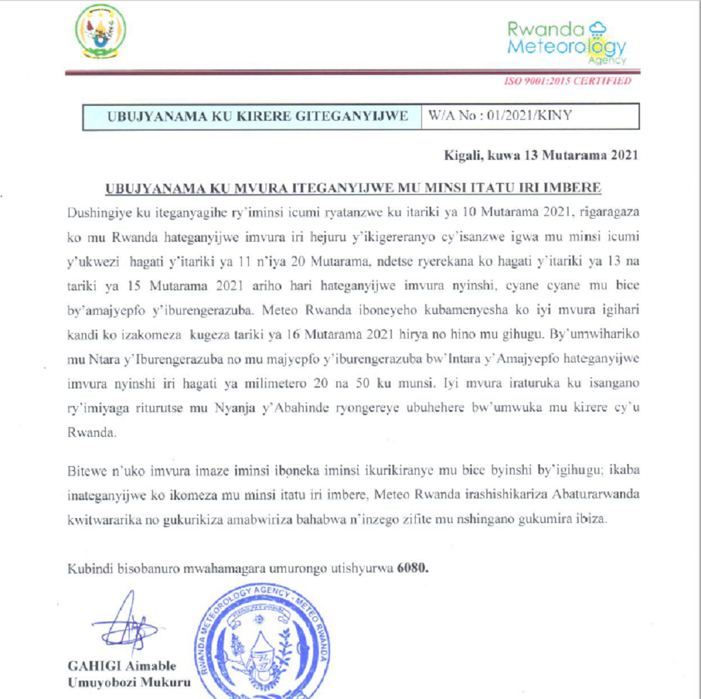 Mu itangazo Meteo Rwanda yatanze kuri uyu wa Gatatu tariki 13 Mutarama 2021, yavuze ko iteganyagihe ry’iminsi icumi ryakozwe ryagaragaje ko kuva tariki 11 kugeza tariki 20 z’uku kwezi hateganyijwe imvura iri hejuru y’ikigereranyo cy’isanzwe igwa, ndetse ryerekana ko hagati ya tariki 13 na 15 Mutarama ari ho hateganyijwe imvura nyinshi.
