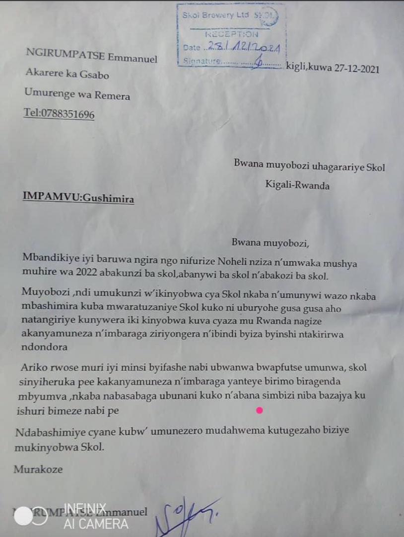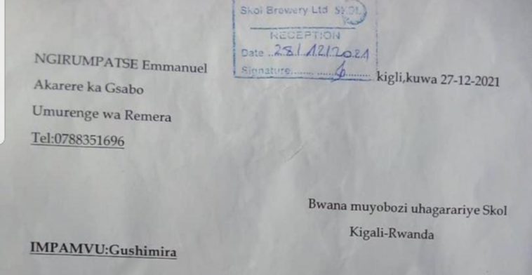 Umugabo witwa Ngirumpatse Emmanuel yandikiye uruganda rwa Skol ibaruwa yo gushimira ariko anarumenyesha ko rwamuha ubunani kuberako afite ubukene butamwemerera kugura ibinyobwa bya Skol kandi akaba ari umukunzi wabyo.