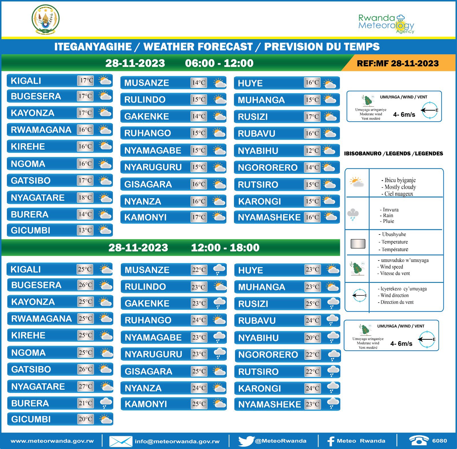 Tariki ya 28 Ugushyingo 2023 hagati ya saa 06:00 na saa 12:00 nta mvura iteganyijwe mu turere twose tw’Igihugu.