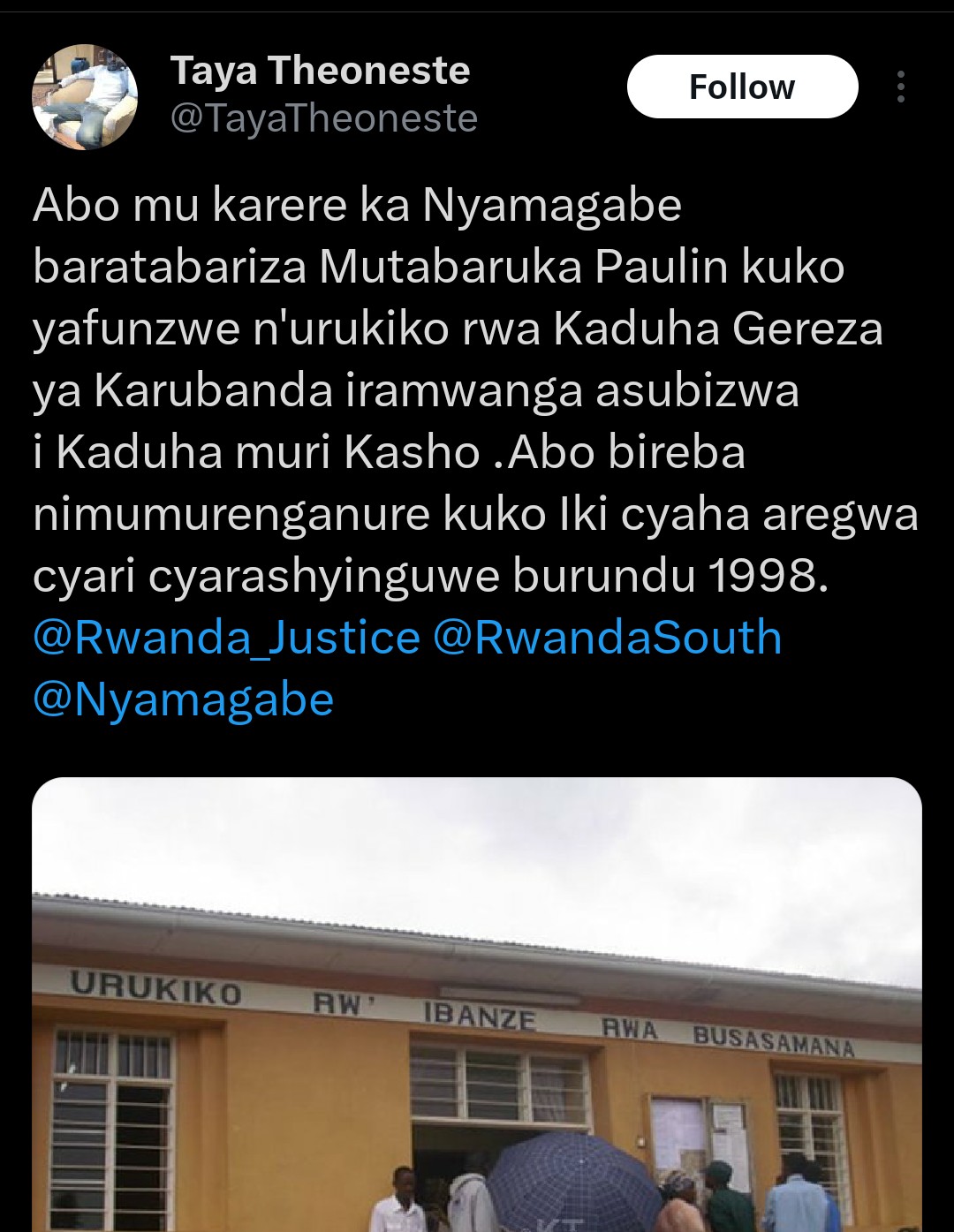 Yagize ati: “Abo mu karere ka Nyamagabe baratabariza Mutabaruka Paulin kuko yafunzwe n’urukiko rwa Kaduha Gereza ya Karubanda iramwanga asubizwa i Kaduha muri Kasho .Abo bireba nimumurenganure kuko Iki cyaha aregwa cyari cyarashyinguwe burundu 1998.”
