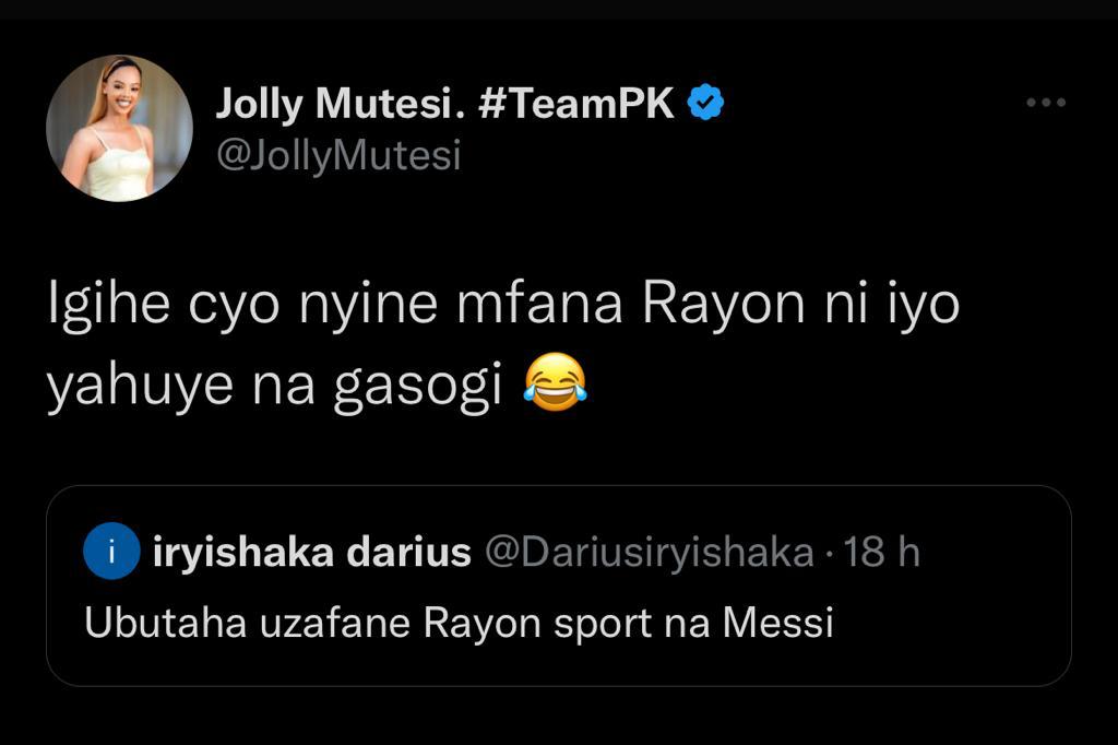 Uyu mukobwa yagiye kurubuga rwe rwa Twitter agira ati:”igihe cyo nyine mfana Rayon ni iyo yahuye na Gasogi”
