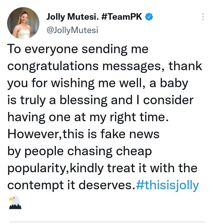 Abinyujije ku rukuta rwe rwa twitter na Instagram, yigaramye abamushinjaga ko atwite, yagize ati “Mbanje gushimira buri muntu wese wamaye feresitasiyo, kuko kubyara ni umugisha, gusa nagirango mbamenyeshe ko amakuru yose ari kunvugwaho ko ntwite ari ibihuha, murakoze”.