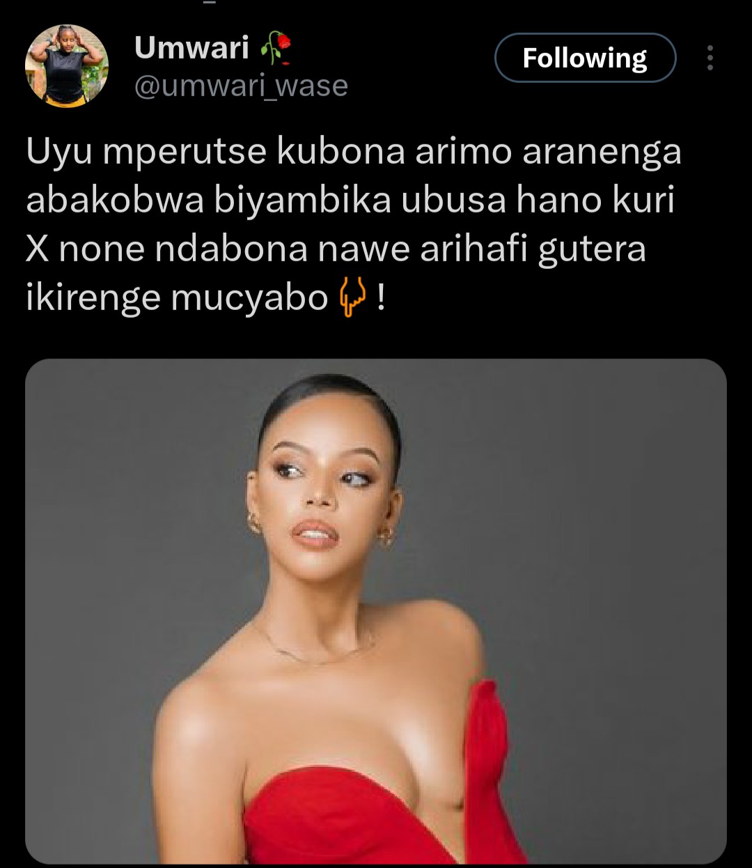 Uwitwa Umwali kuri X, yihaye Mutesi Jolly nyuma yo kumubona yambaye agakanzu kumugaragaza mu gatuza ke.