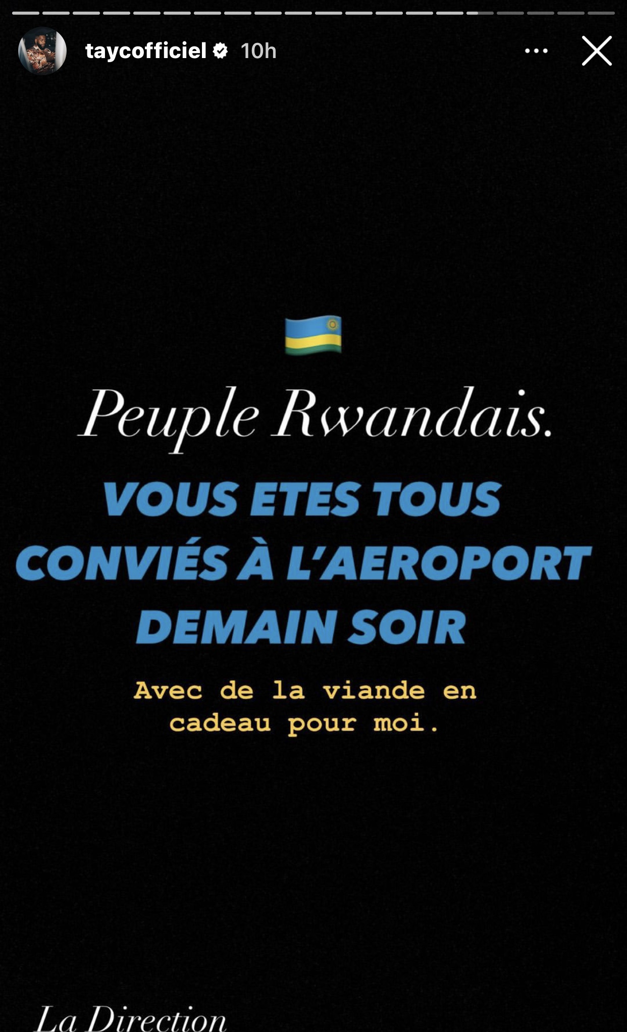 Abinyujije kuri story ya instagram ye, Tayc yanditse amagambo agira ati « Peuple Rwandais vous êtes tous conviés à l’aéroport demain soir avec la viande en cadeau pour moi » ugenekereje mu Kinyarwanda bishatse kuvuga ngo « Banyarwanda mwese muratumiwe ku kibuga cy’indege ejo nimugoroba hamwe n’inyama nk’impano ».