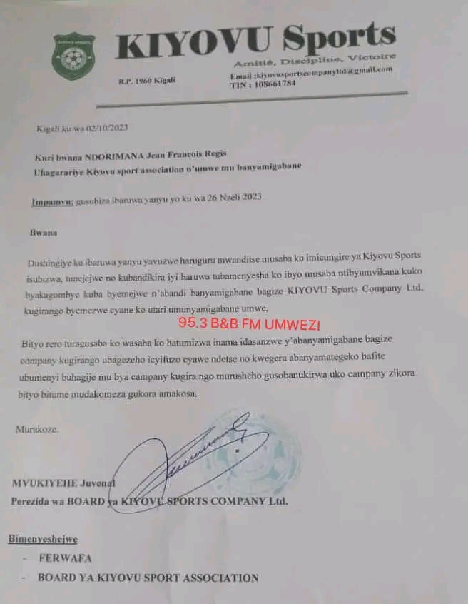 Perezida wa Board ya KIYOVU SPORTS Company Ltd Bwana Juvenal MVUKIYEHE, yasubije Bwana Ndorimana Jean François Regis, Perezida wa KIYOVU Sports Association.