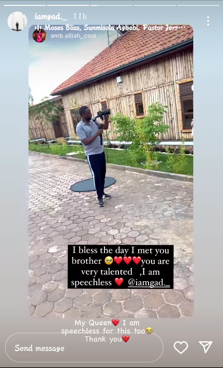 Abinyujije ku rukuta rwe rwa Instagram, kuri story ye, Alliah Cool yatakagije director Gad akaba na gafotozi we, yagize ati ” I bless a day I met you brother😯❤️❤️❤️, you are very talented , Iam speechless❤️”.