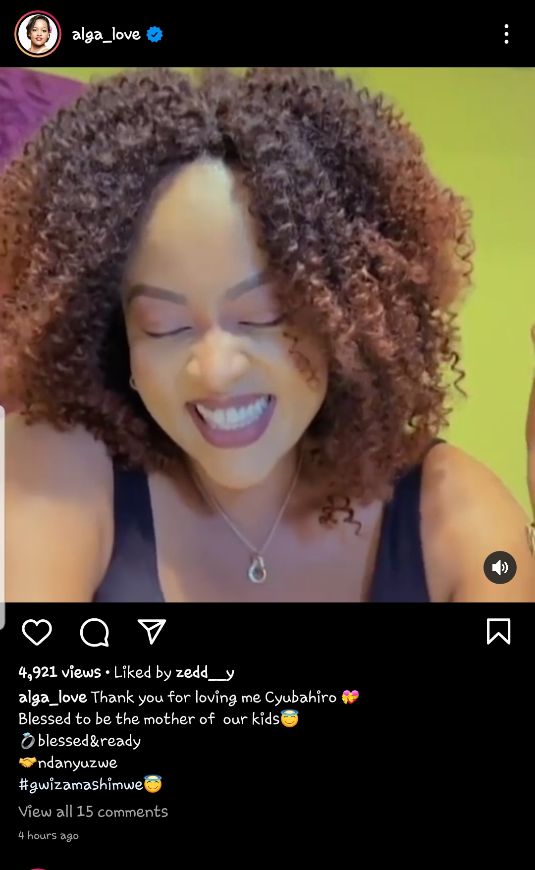 Mu magambo ye yaraherekejwe n’amashusho agaragaza umunezero n’akanyamuneza ku maso, Aline yagize ati “Thank you for loving me Cyubahiro [warakoze kunkunda Cyubahiro], Blessed to be the mother of our kids [N’umugisha kuba mama w’abana bacu] Blessed and ready [N’umugisha kandi nditeguye]. Ndanyuzwe”. Ukurikije aya magambo ya Aline gahongayire bigaragazako ashobora kuba atwite inda y’umukunzi we, bishoboka ko yitwa Cyubahiro nkuko bigaragara mu nyandiko ye.