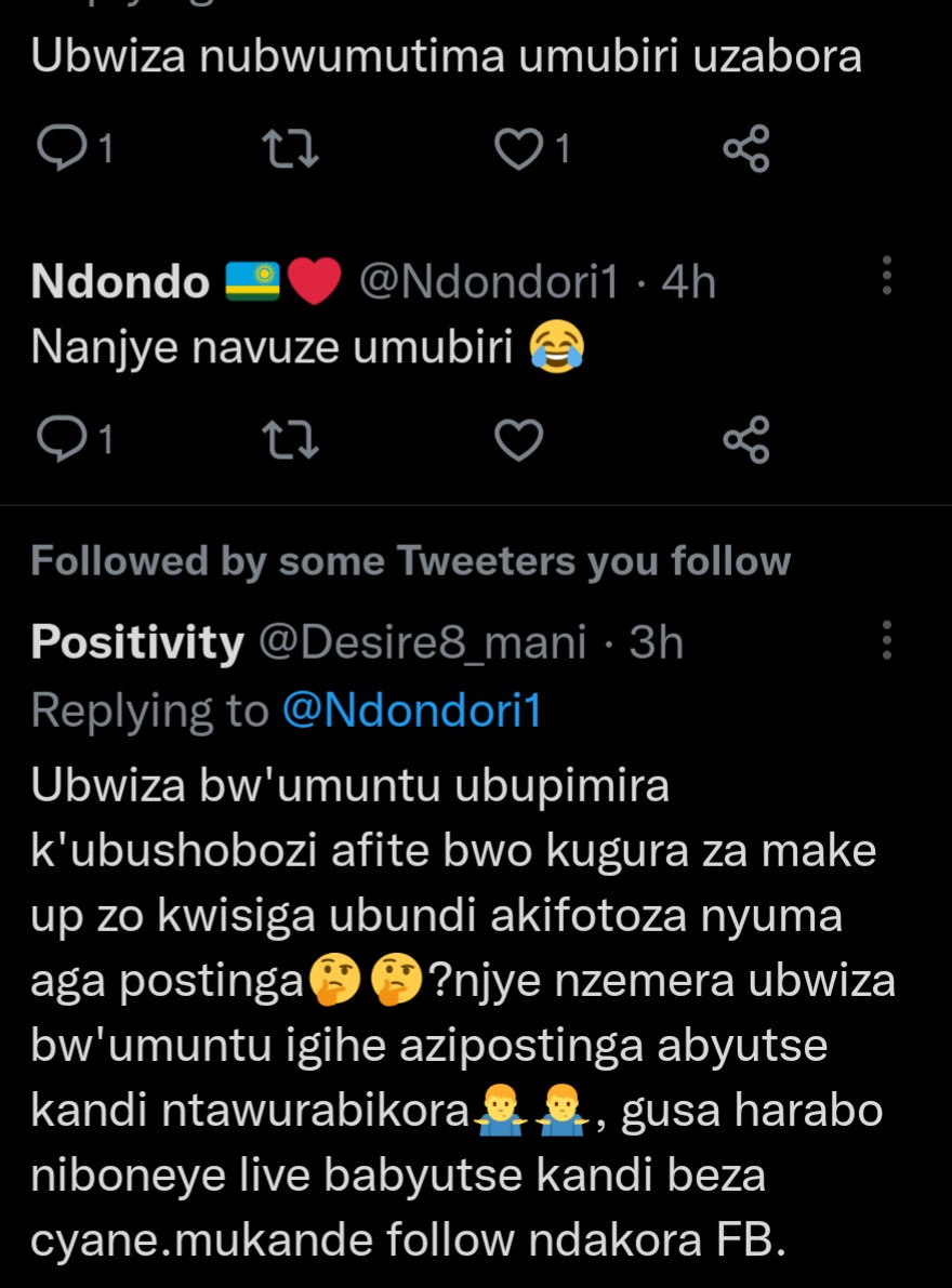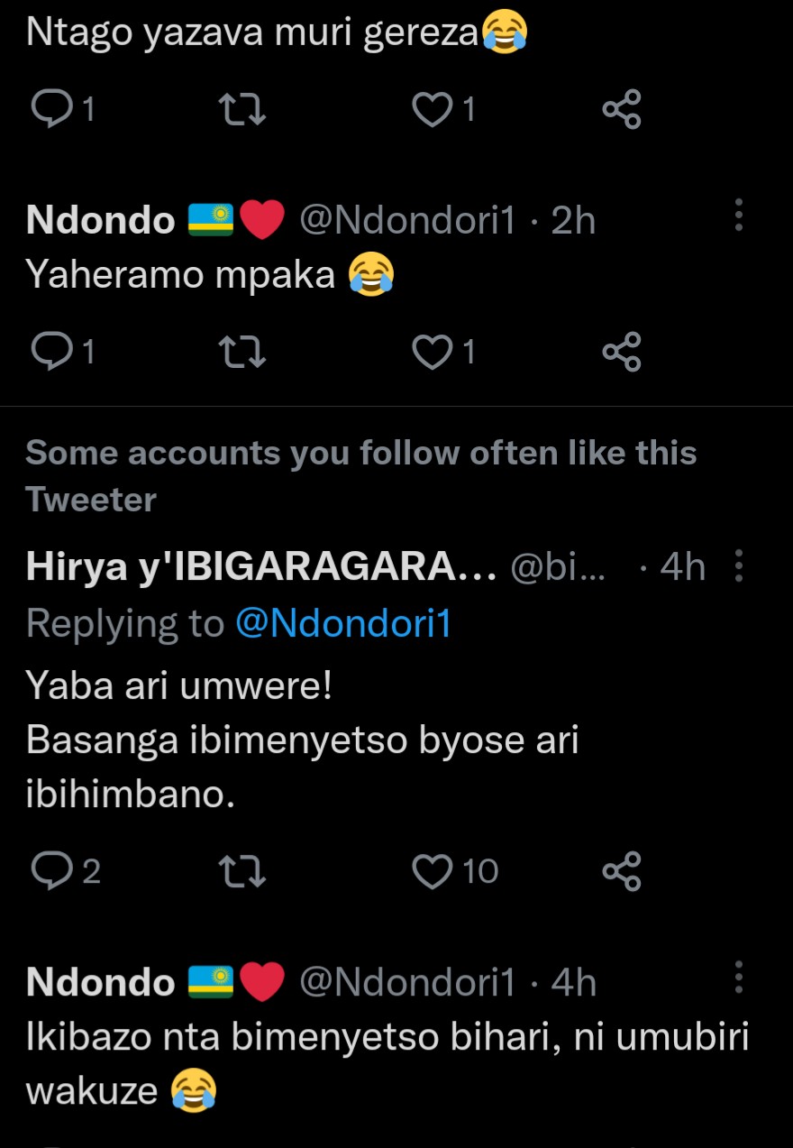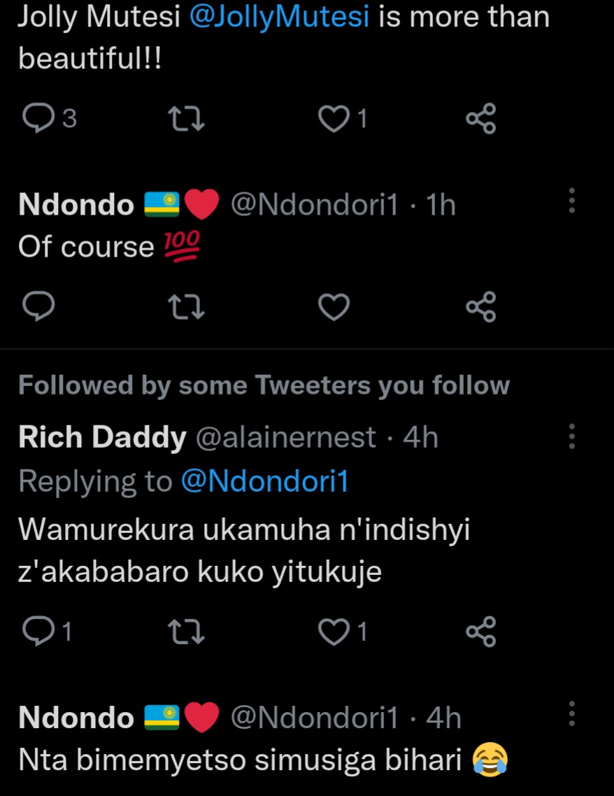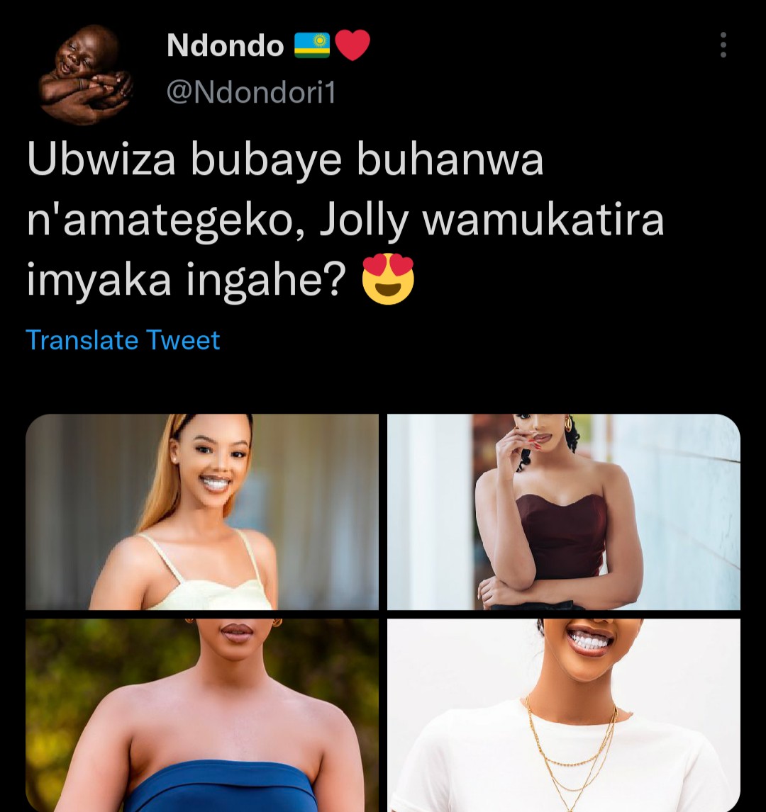 Ukoresha urukuta rwa Twitter ukoresha amazina ya Ndondo, yifashe asohora amafoto ya Mutesi Jolly ni uko maze arenzaho amagambo agira ati: “Ubwiza bubaye buhanwa n’amategeko, Jolly wamukatira imyaka ingahe?”