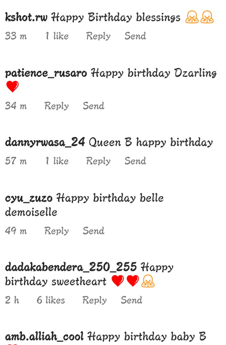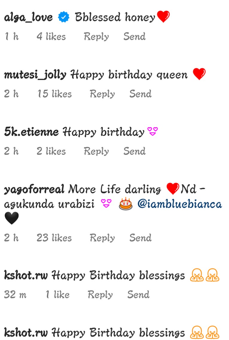 Yago yagize ati: “Ubuzima bwinshi mukundwa❤️ Ndagukunda urabizi” hari n’abandi benshi bagiye bamwifuriza isabukuru nziza y’amavuko harimo nka Mutesi Jolly, Aline Gahongayire, 5k Etienne, Keny k-shot