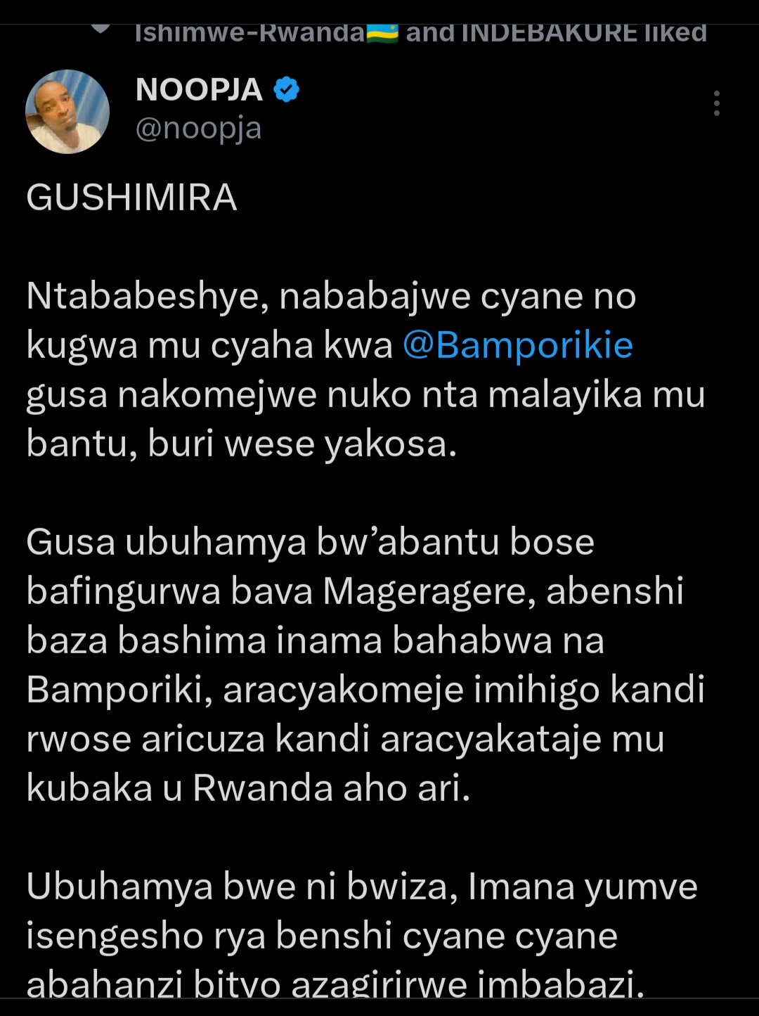 Nduwimana Jean Paul uzwi nka Noopja yagize ati: “GUSHIMIRA! Ntababeshye, nababajwe cyane no kugwa mu cyaha kwa Bamporikie gusa nakomejwe nuko nta malayika mu bantu, buri wese yakosa.