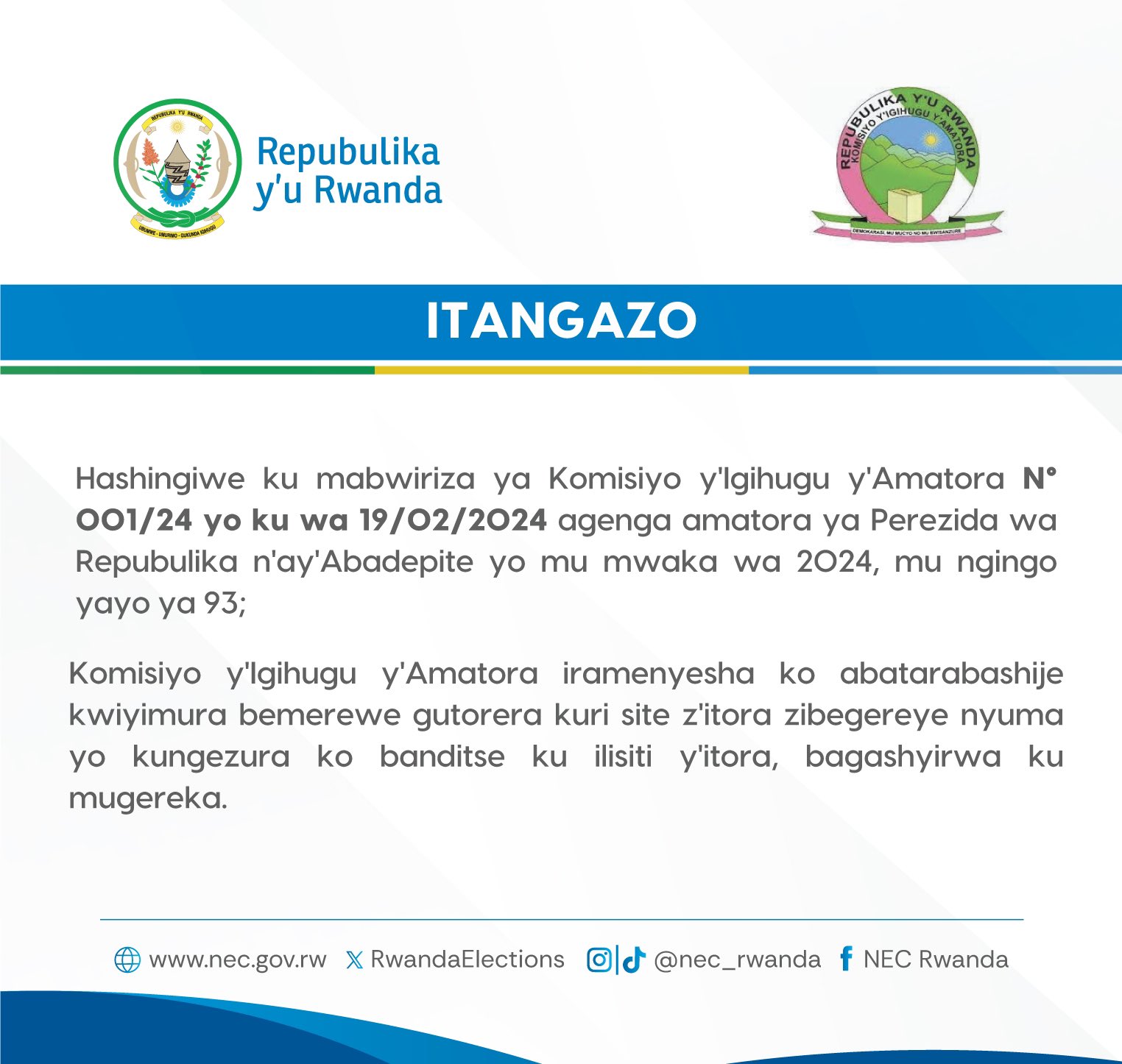Itangazo ryagiye hanze kuri uyu wa 15 Nyakanga 2024, rigira riti “Niba utarabashije kwiyimura, ukaba wanditse ku ilisiti y’itora, wemerewe gutorera kuri site y’itora ikwegereye ku mugereka.”