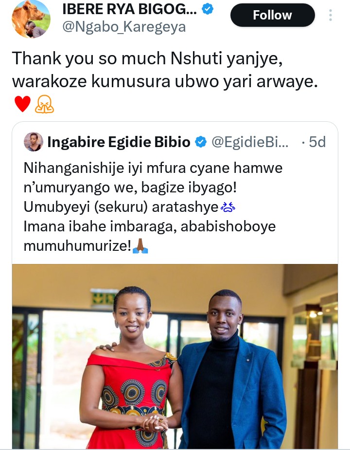 Abinyujije ku rukuta rwe rwa X, Ngabo Karegeya yashimiye Ingabire agira ati “Wakoze cyane Nshuti yanjye, warakoze kumusura ubwo yari arwaye.”