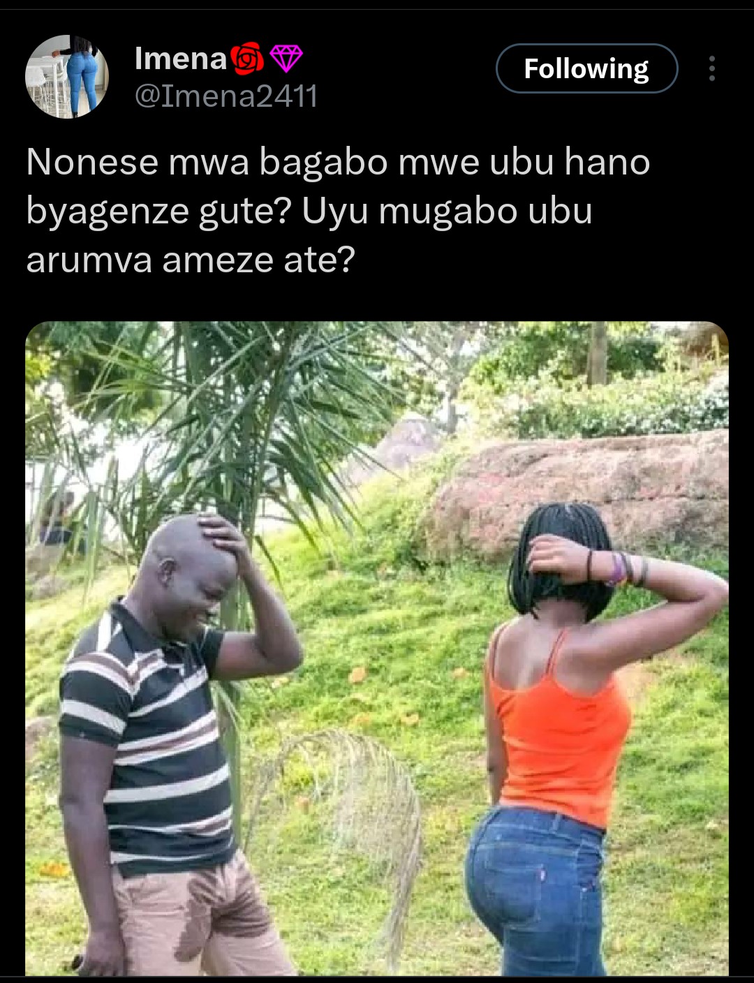 Ku rubuga rwa Twitter, hakomeje gusakara ifoto y’umugabo wisohoreyeho nyuma yo kubona inyuma h’umukobwa.