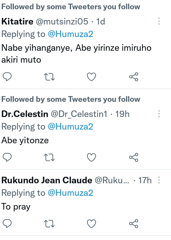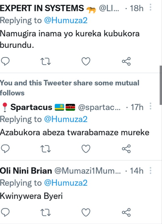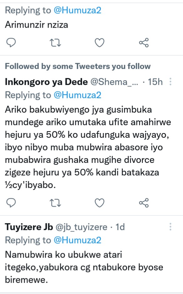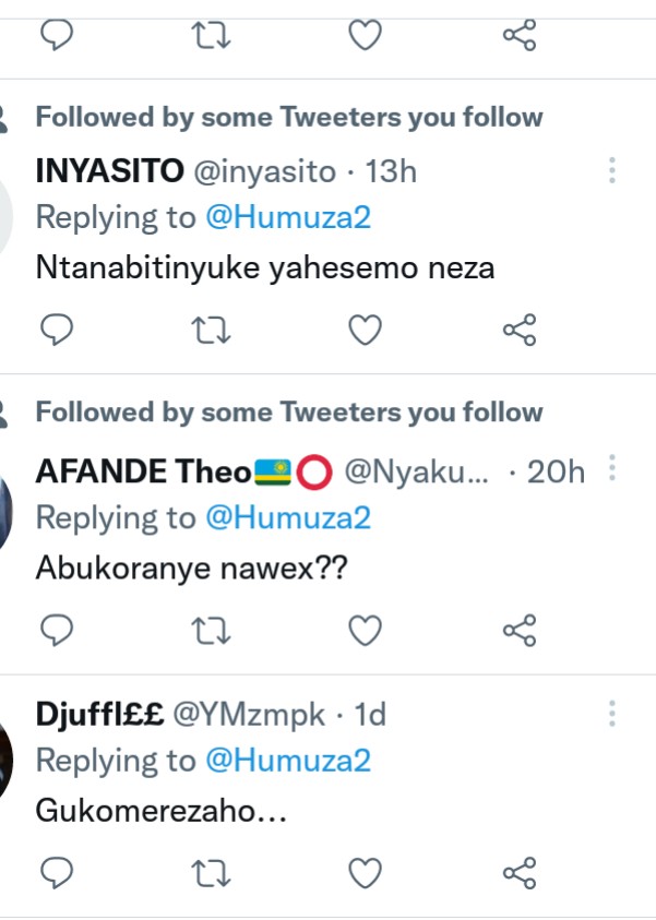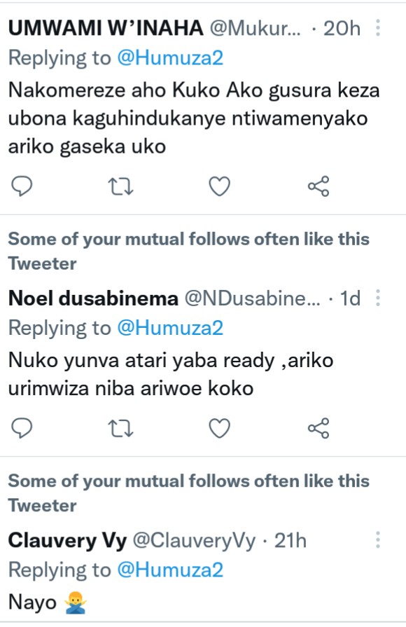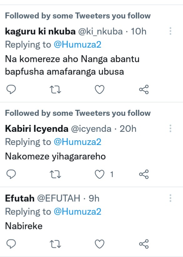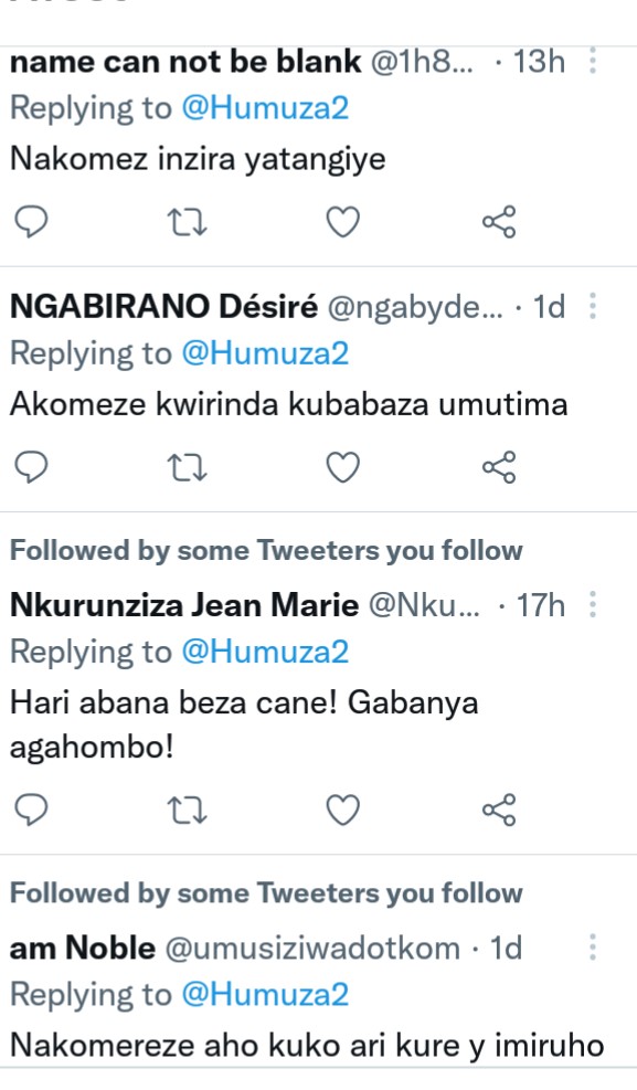 Bagenzi be bamusubije ntakabuza, ndetse abasore benshi bakomeza kugaragaza ko bamugira inama yo gukomeza inzira yatangiye. Dore ibyo yasubijwe.