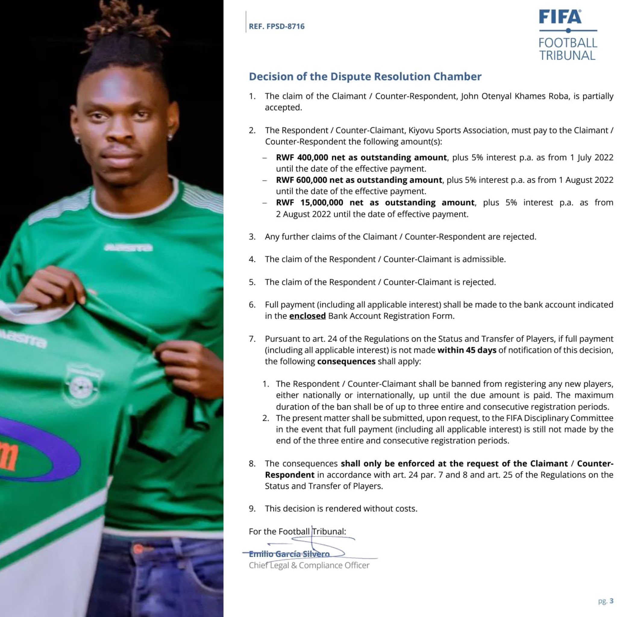 Ni ukuvuga ko Kiyovu Sports itegetswe kwishyura ayo mafaranga bitarenze iminsi 45. Nitabikora izabuzwa kwandikisha abakinnyi bashya.