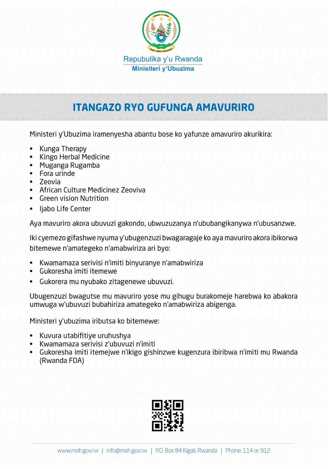 Minisiteri y’ubuzima mu Rwanda yasohoye itangazo rigaragaza amavuriro agera ku munani yafunzwe kubera gukora mu buryo butemewe n’amategeko harimo nko gucuruza imiti itemewe ndetse no kuba ayo mavuriro yakoreraga munyubako zitagenewe ubuvuzi n’ibindi.