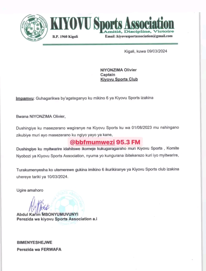 Komite Nyobozi ya Kiyovu Sports yahagaritse Kapiteni wayo Niyonzima Olivier ‘Sefu’ imikino 6 ya shampiyona isigaye, baramushinja kutubaha ibiri mu masezerano.